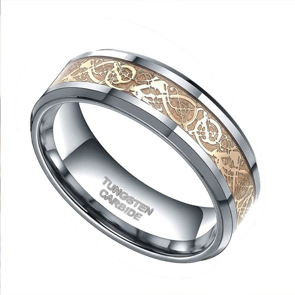 【龍紋指輪】古代ケルト族の描法を用いて描かれたドラゴンのイメージには、魔法をかけったお守りのタングステン指輪であります。派手過ぎず、地味過ぎない、普段使いでもフォーマルでも大活躍する、良いのメンズリングです。