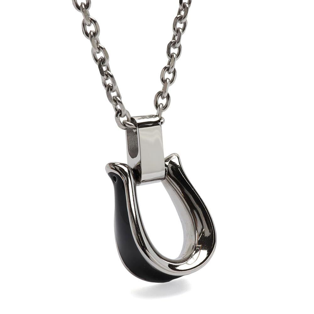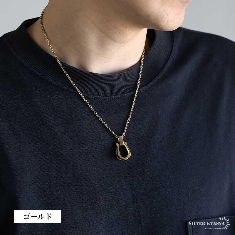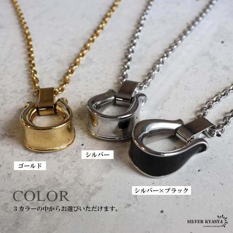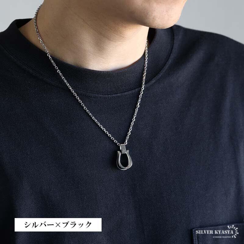 ステンレス 馬蹄ネックレス ホースシューネックレス あずきチェーン ゴールド シルバー 18KGP メンズ 金属アレルギー対応(シルバー×ブラック)