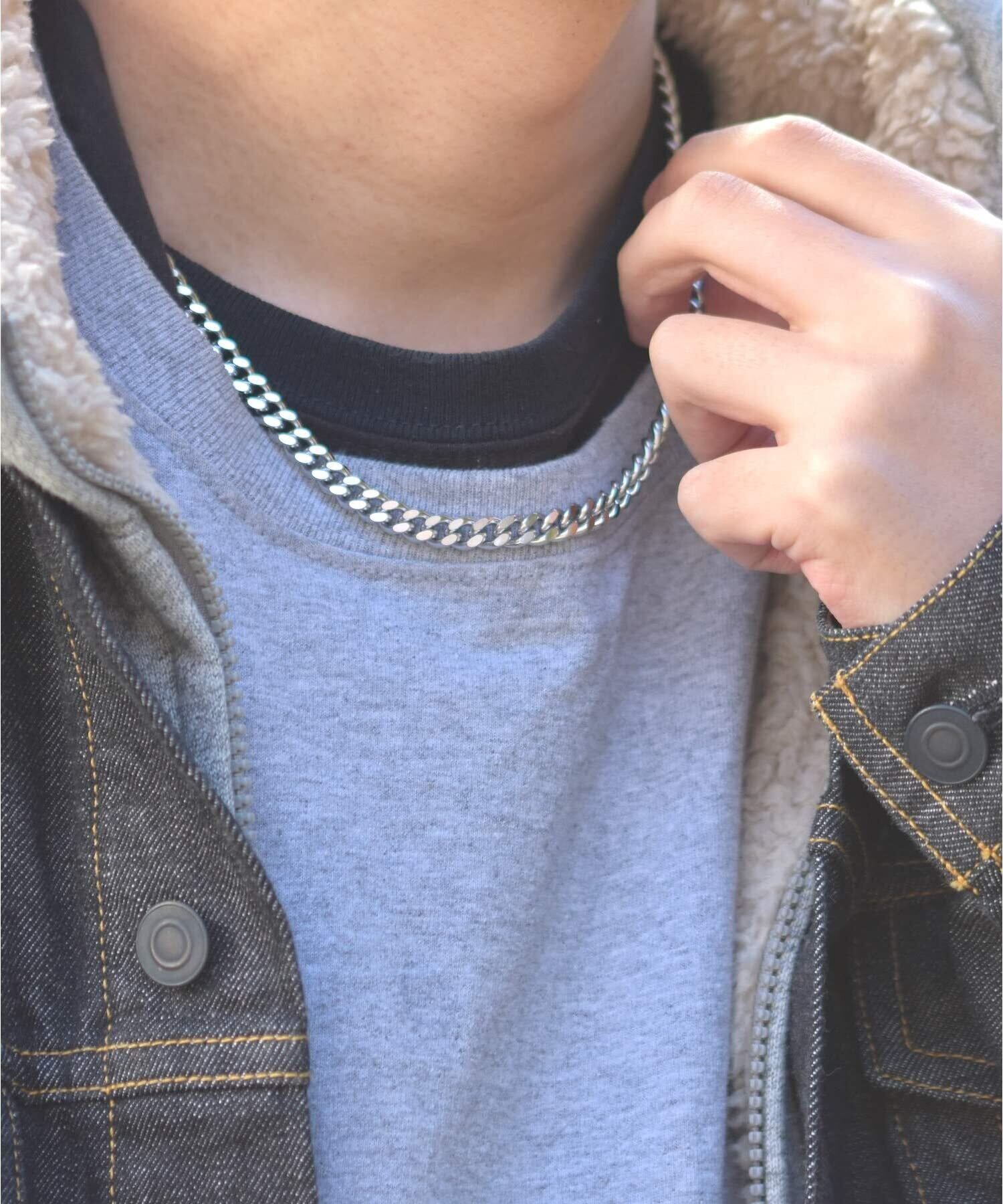 WEBストア限定商品 ペンダントをつけないメンズファッション注目のチェーンネックレス 【チェーンネックレス/6.5mm幅カット喜平/50cm】 ペンダントトップをつけない、トレンドのシンプルなチェーンネックレス。 クリップの横に、ライオンハートロゴ入りプレートがデザインされています。 チェーンの長さはベーシックな50cmで、程よいボリューム感が特徴。 部分的にメッキを施したブラックとシルバーの2色展開です。 オーバーサイズのTシャツなどトレンドのストリートスタイルやセットアップスタイルにピタっとハマります。 程よく存在感のあるボリュームで、全体の長さも長すぎずすっきりとした印象になるように設計されています。 アレルギーに強いステンレス素材は、色の変化等にも耐性があり、シルバー素材や合金素材の色の変化が気になる方にもおすすめです。 【LH-1-エルエイチワン-】 「初めて着けるアクセサリーがライオンハートである様に」という想いから生まれた、ファッション・スタイル・シーンを選ばないデイリーユースなコレクション。 【LION HEART-ライオンハート-】 1996年から続くドメスティックブランド。 ブランドコンセプトは『常に変化を恐れず 新たな価値観をシェアし続ける アクセサリーブランド。』 ※クリップバネ故障や変色の原因となりますので入浴や海水浴等、水場でのご使用はお控えください。 ■チェーン全長 50cm ■素材 サージカルステンレス ■サイズ詳細 【チェーン幅】0.65cm【重量】46.5g