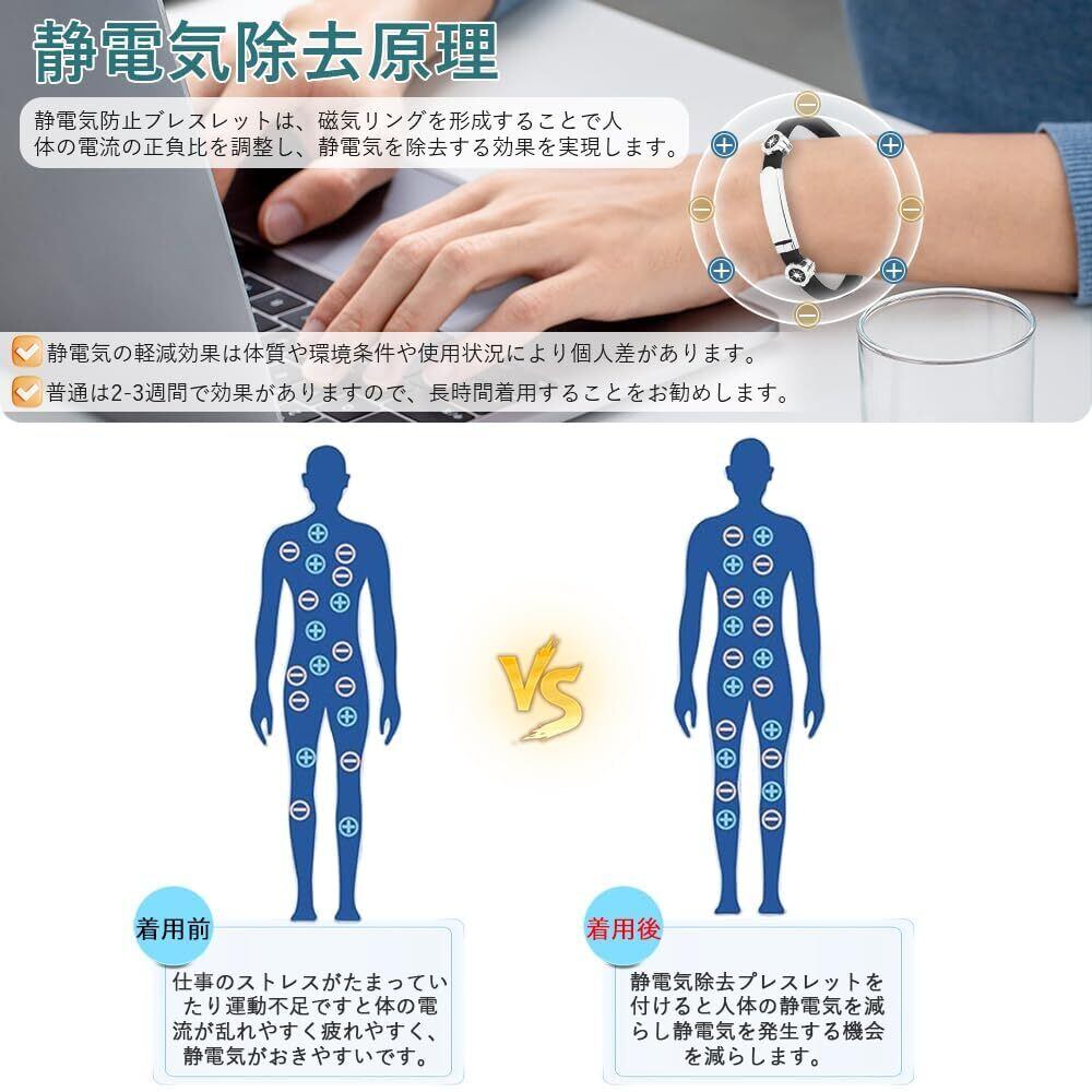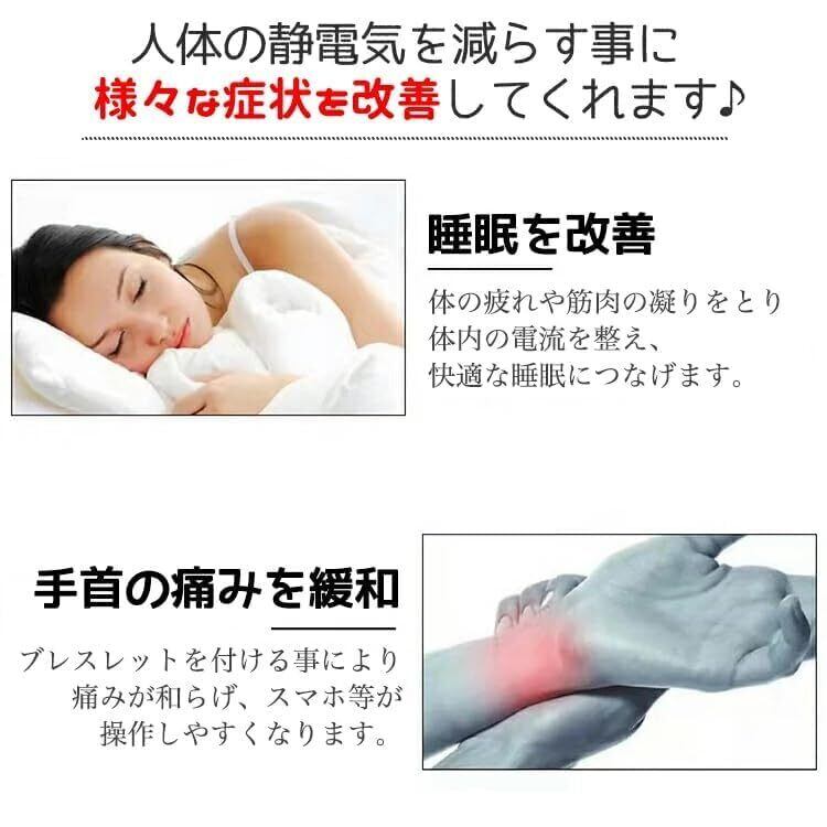 【静電気除去の人気商品】静電気防止ブレスレットは、磁気リングを形成し、電流の正負バランスを調整することで、効果的に静電気を除去します。ご使用から2~3週間で静電気の軽減を実感いただけますので、まずは1週間以上の着用をお試しください。着用期間が長くなるほど、効果が持続的に向上します。今すぐお試しいただき、その効果を実感してください!秋冬乾燥季節で、静電気に敏感な方や、肌の不快感を軽減したい方に最適です。