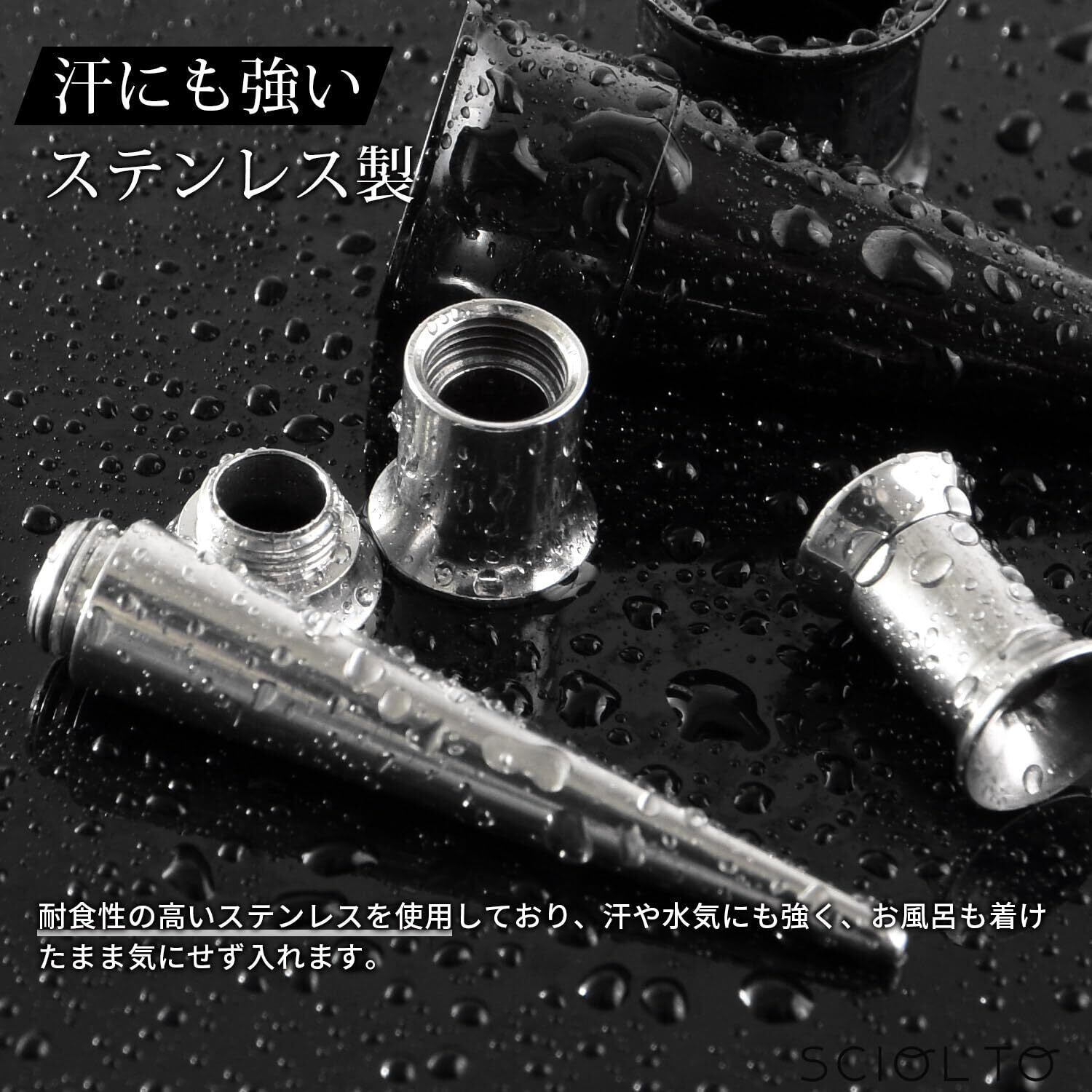 【汗にも強いステンレス製】耐食性の高いステンレスを使用しており、汗や水気にも強く、お風呂も着けたまま気にせず入れます。またアレルギー反応が出にくい素材ですので敏感肌の方にもオススメです。