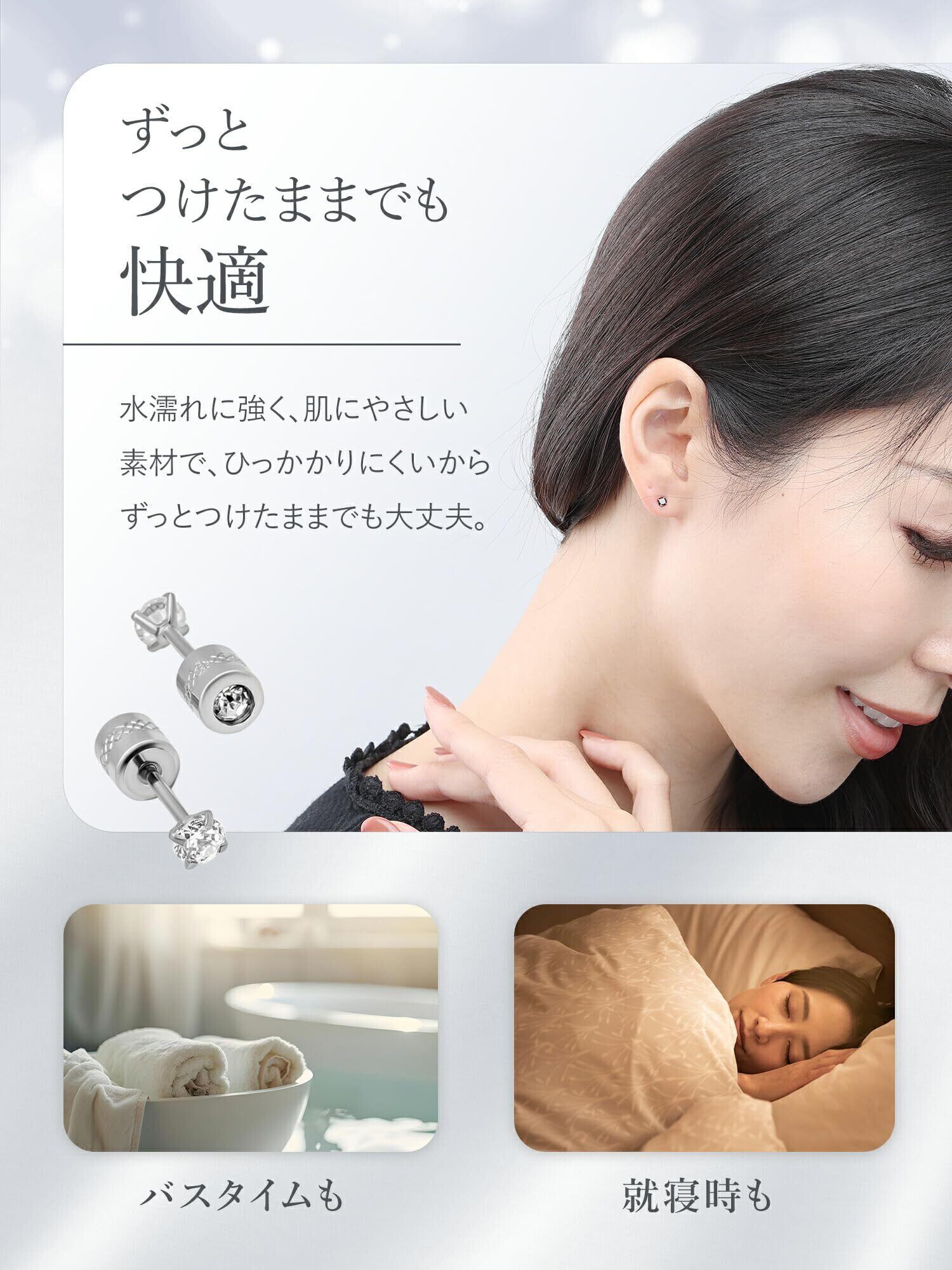 【失くさない、痒くならない。毎日つけっぱなしOK】キャッチがネジ式(スクリューバック)だから、外れて無くす心配が少なく、お風呂や就寝時もそのままで安心。サージカルステンレス製なので、金属アレルギーが気になる方にもやさしく、赤みやかゆみを気にせず毎日つけられます。