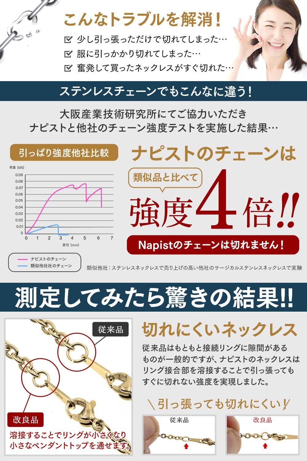 【引っ張っても切れにくいネックレス】一般的なチェーンは接続リングの隙間から切れやすい問題がありましたが、ナビストのチェーンは接合部を溶接することで切れにくく丈夫なチェーンに仕上がりました。お気に入りのネックレスをより長くお使い頂けます。