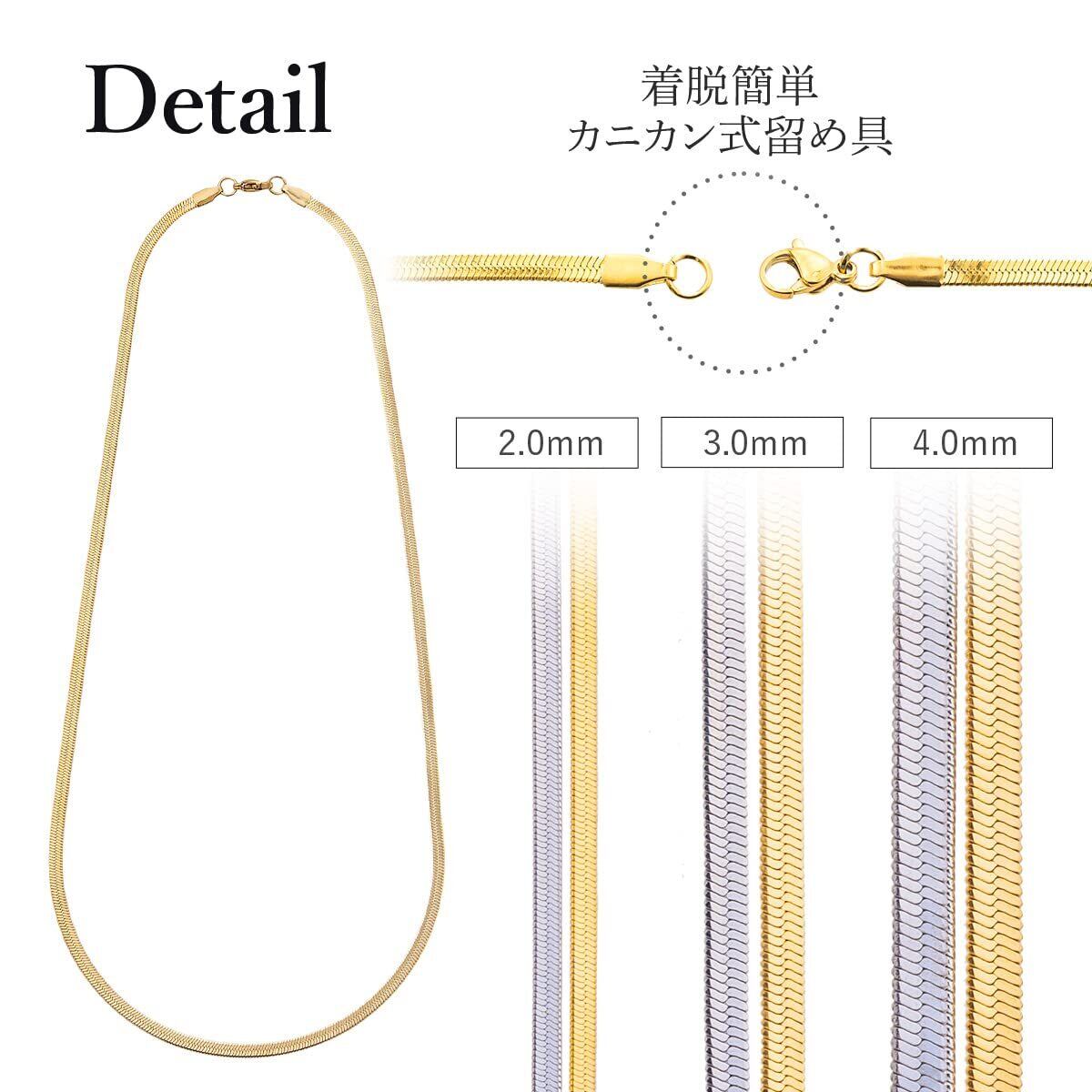 【バリエーション豊富】チェーン幅が2mm,3mm,4mmの3種類、チェーンの長さが40cm,50cm,60cm、カラーがシルバー、ゴールドの2色の計18種類からお選びいただけますので貴方のお気に入りがきっと見つかります。シンプルに着用したり、2,3本重ねて着けたりお手持ちのチャームなどと合わせてみたりとお好みのスタイルでお楽しみいただけます。