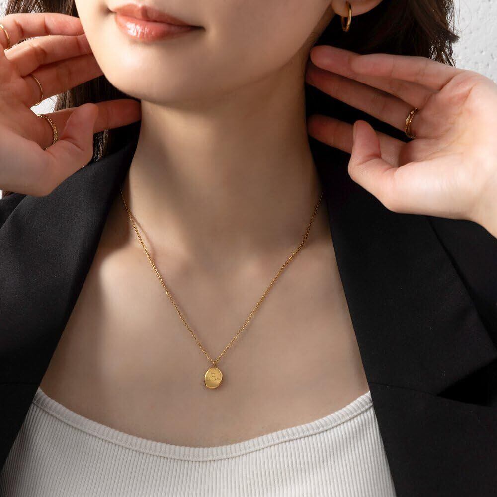 手書き風メッセージロゴが入ったコインネックレス。ニュアンスのある形と使い勝手の良いサイジングで大人っぽい雰囲気に。コインにはヘアライン加工が施されていて、ほど良く重みもあり高見えするデザインです。主張しすぎないからお手持ちのネックレスとの重ねづけにも活躍しそう◎錆びにくく傷に強いステンレス製です。