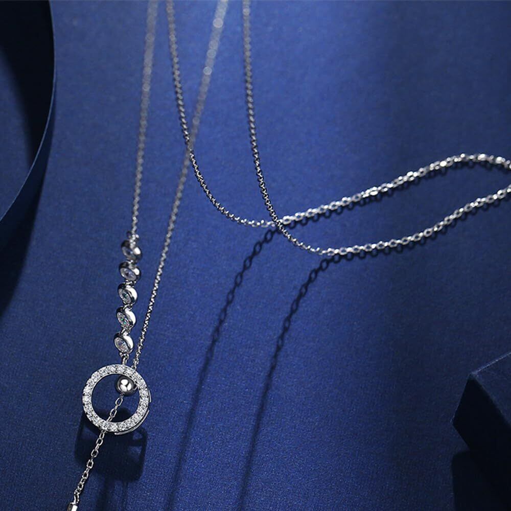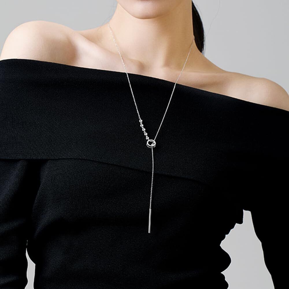 「エレガントデザイン」リングモチーフのY字型ロングネックレス。ペンダントの長さ調節が可能で、柔らかなジルコニアの輝きが上品な雰囲気を演出。チェーン長80cmのバランスの取れたサイズ設計で、日常のコーディネートにアクセントを加え、時代を超えたスタイリッシュな装いを簡単に実現します。