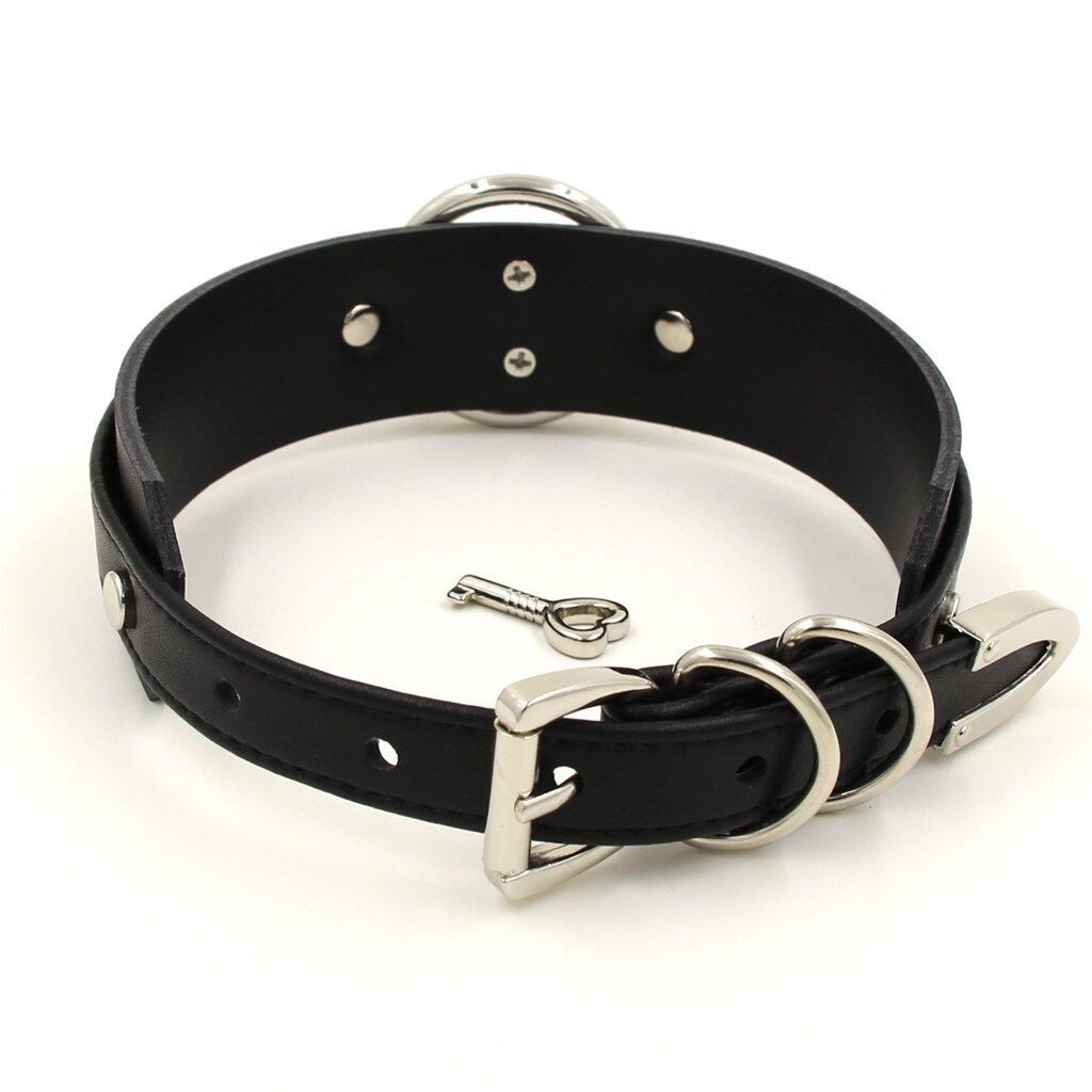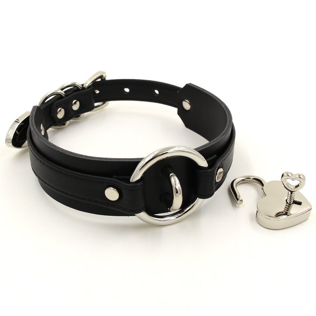 チョーカー ハート 首輪 南京錠 リング PU レザー 黒 (ブラック&シルバー)
