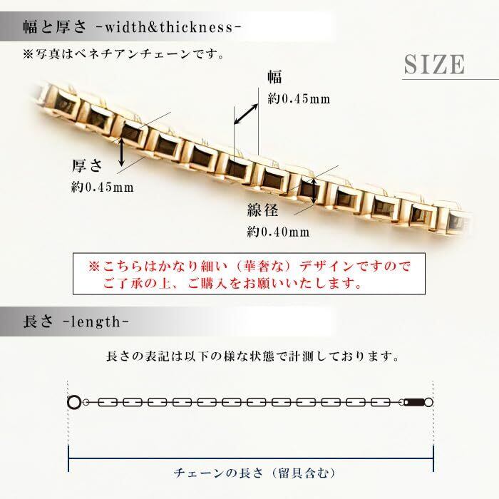 【サイズ詳細】厚さ:約0.45mm / 幅:約0.45mm / 線径:約0.40mm / プレート幅:約2.9mm ※ペンダントトップが通らないなどございます場合は、当店までご相談くださいませ。 ※こちらはかなり細い(華奢な)デザインですのでご了承の上ご購入をお願いいたします。