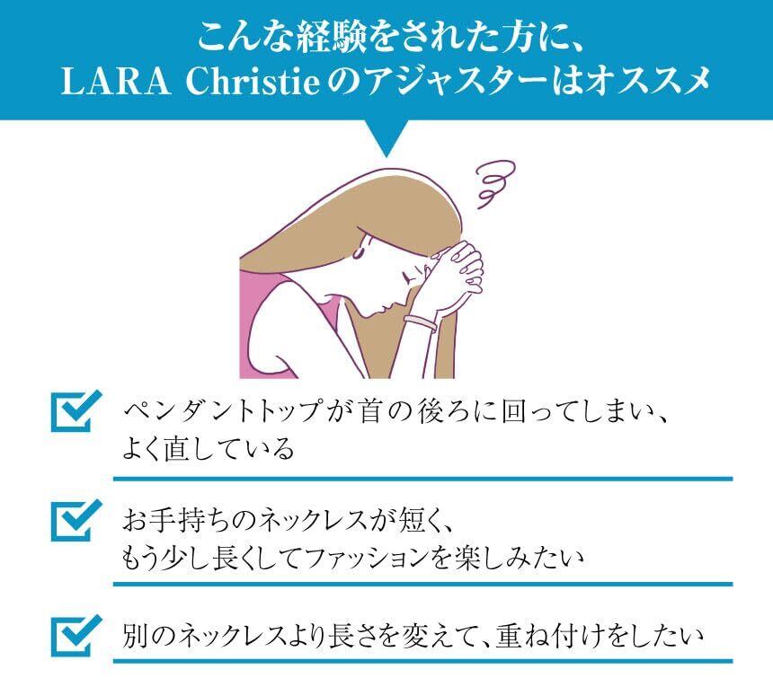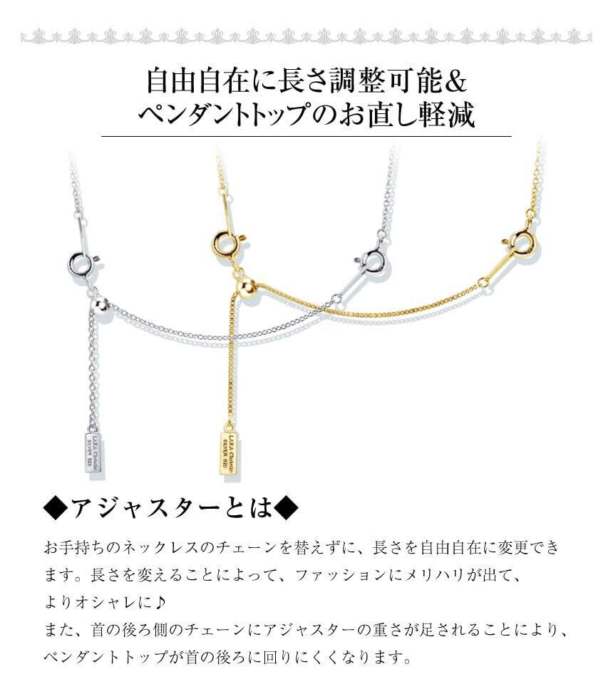 LARA Christieから、もっと自由にコーディネートを楽しんで頂きたい気持ちを込めて、アジャスターチェーンをご用意致しました。人気素材シルバー925にロジウムコーテング・イエローゴールドコーティングを施したジュエリーと同じ仕様。ベネチアンチェーンが輝きます。スライド式を採用し、長さ調節が着用中でも自由自在。簡単に変更が可能で、最長7cmまで無段階で調節が可能です。服装に合わせて長さを変更することで、同じネックレスも全く違う表情を見せます。夏はデコルテに、冬はニットの上から胸元に。コーディネートの幅が広がります。アジャスターの先端にLARA Christieのロゴを刻印した、ロゴプレートをあしらいました。1つ持っているだけでおしゃれの幅が広がること間違いなしのアイテムです。