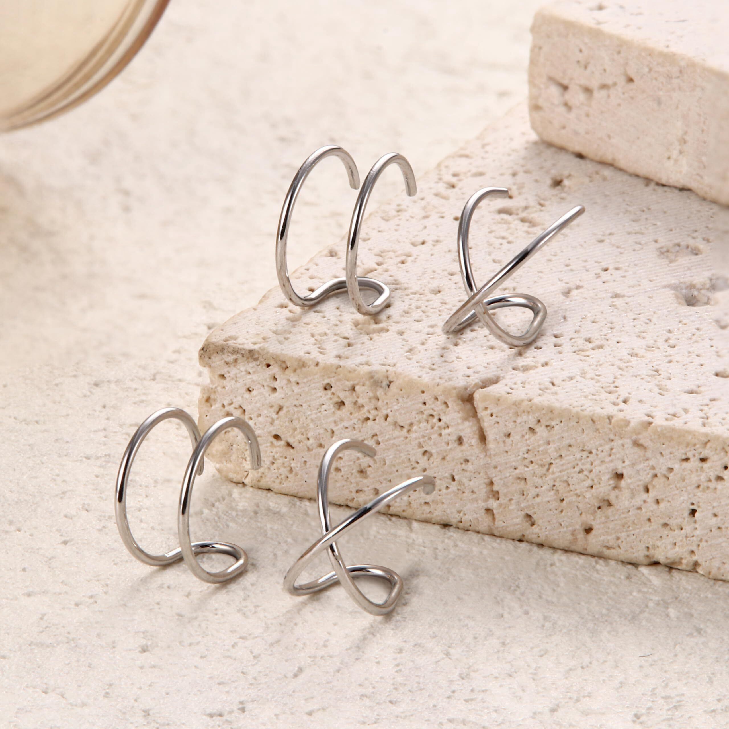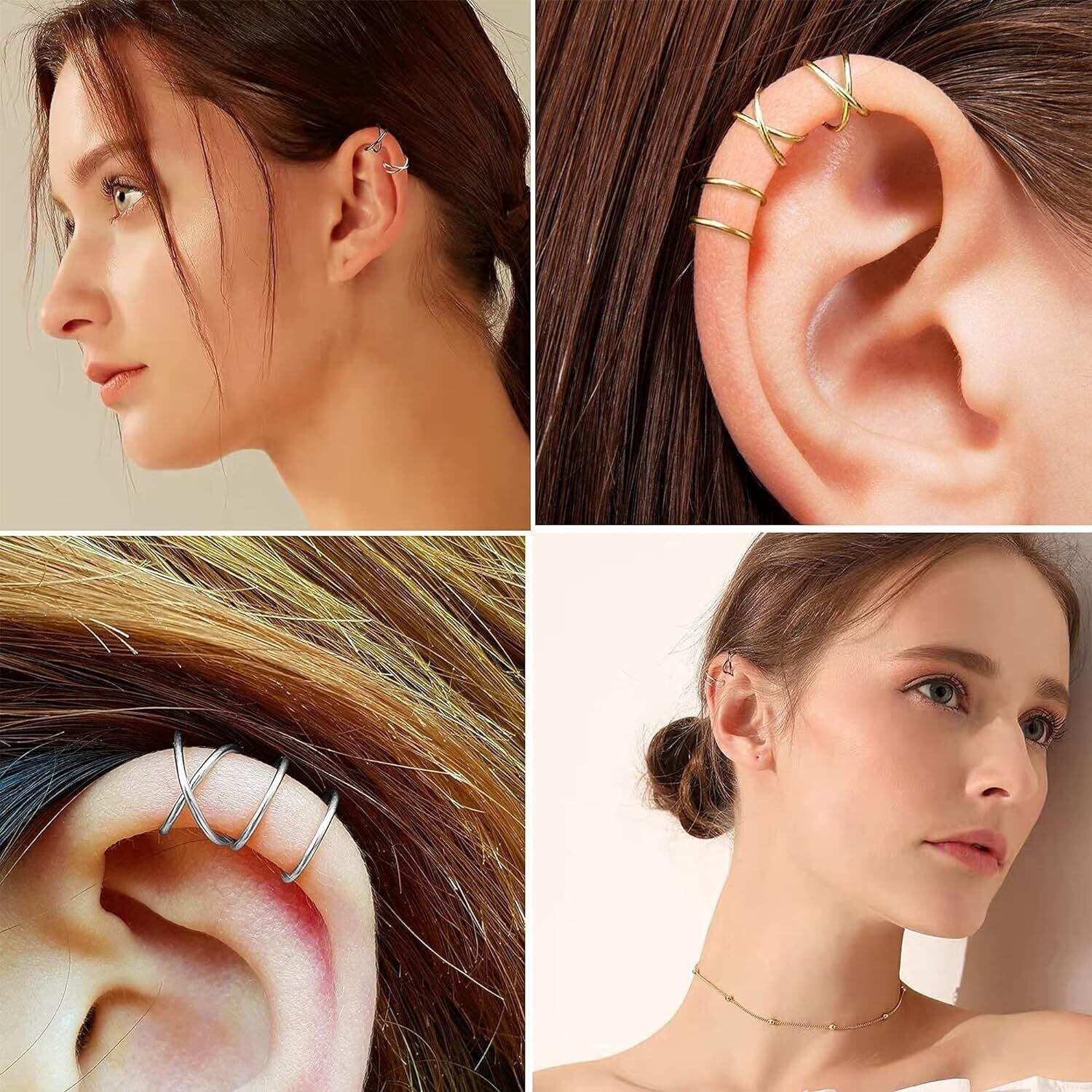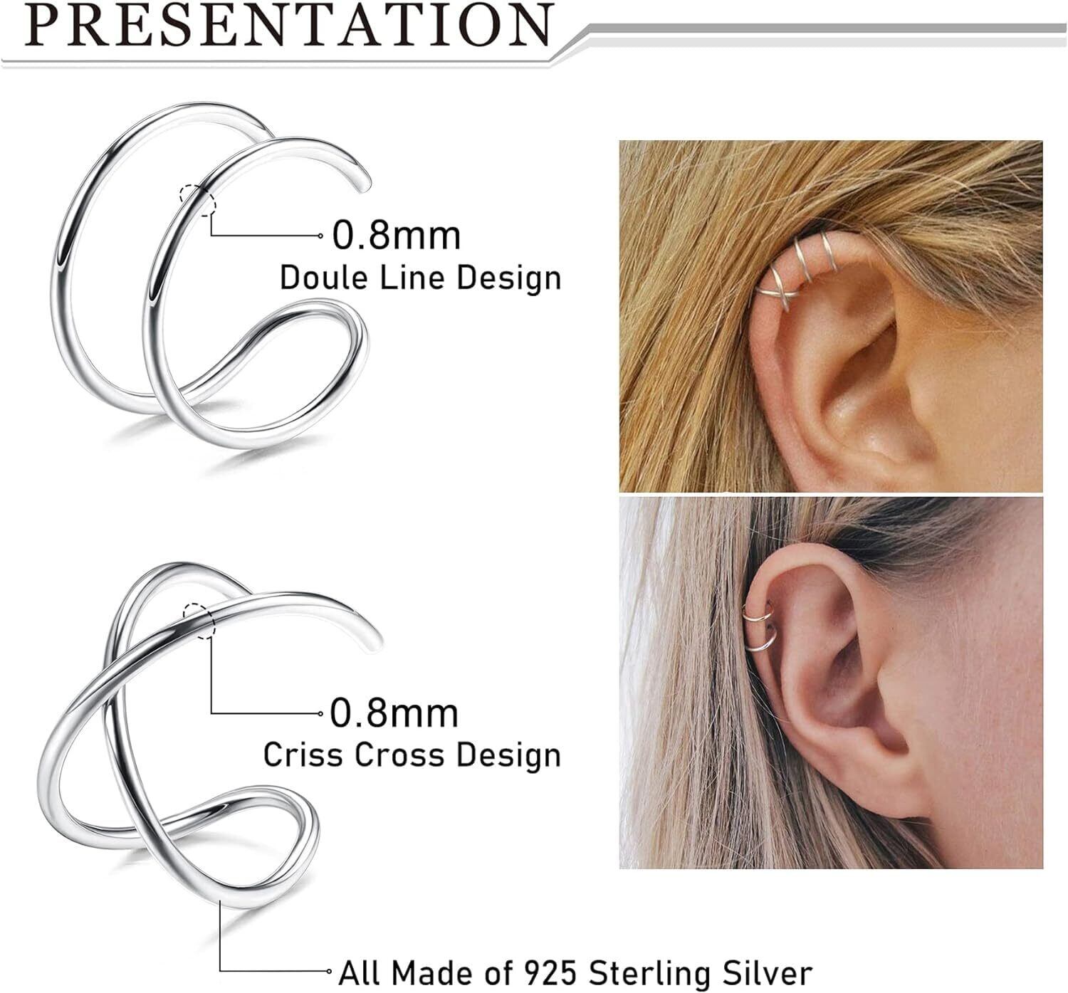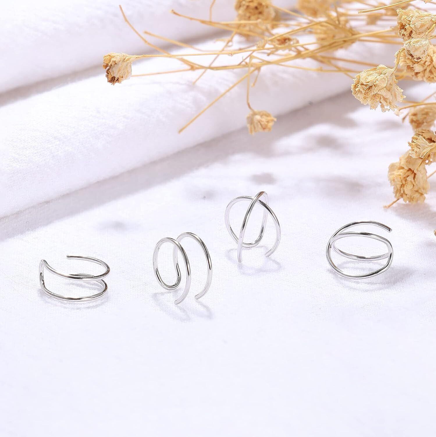 シルバーイヤーカフセットさまざまなデザインの軟骨イヤーカフ4個が入手できます。クラシックでスタイリッシュなデザイン、女性にも男性にも適した、素晴らしい体験をお届けします。スターリングシルバー925素材は柔らかいため、イヤーカフを簡単に調整して耳によりよくフィットさせることができます。
