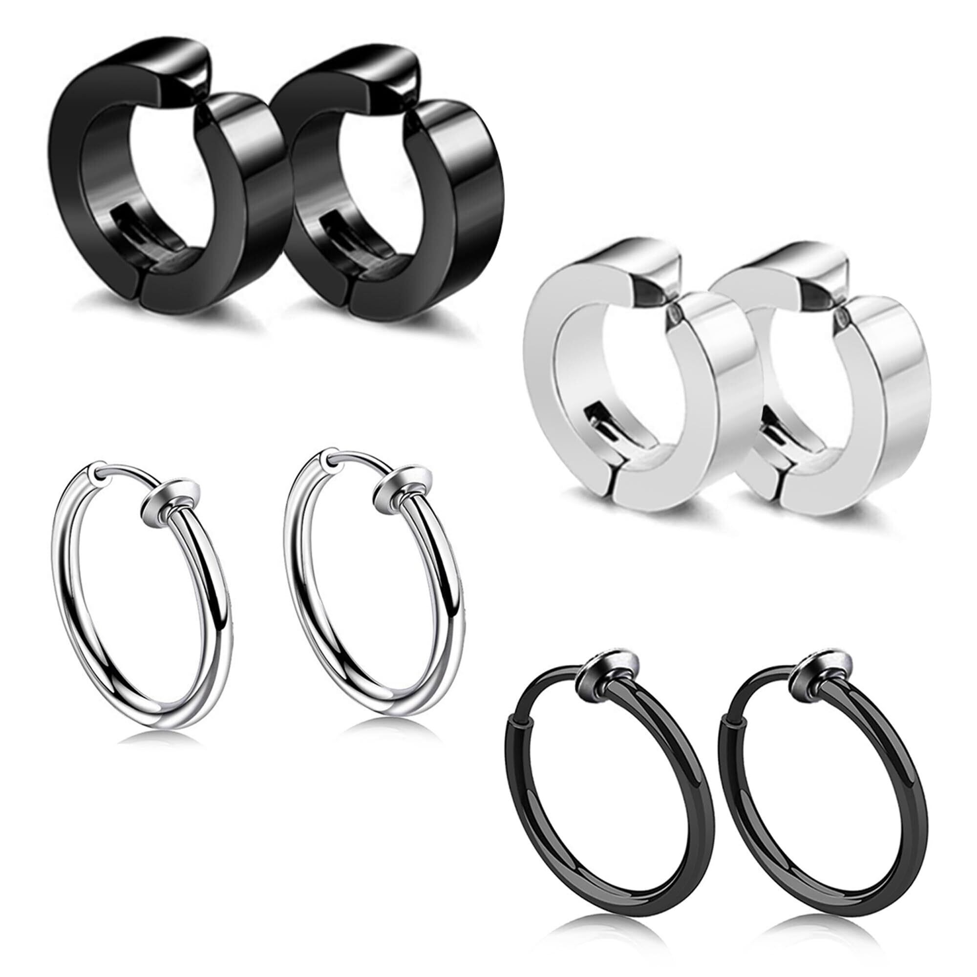 【お得な2色 イヤリング セット 】シルバー(4個)、ブラック(4個)(4ペア合計8個セットです!)人気の 両耳用 リング フープ ノンホール イヤリング デザインで。シングルピアスとして片耳だけにつけたり、両耳につけたりその日の気分で使い分けできます。カップルやお友達同士でシェアすると更にお得です!