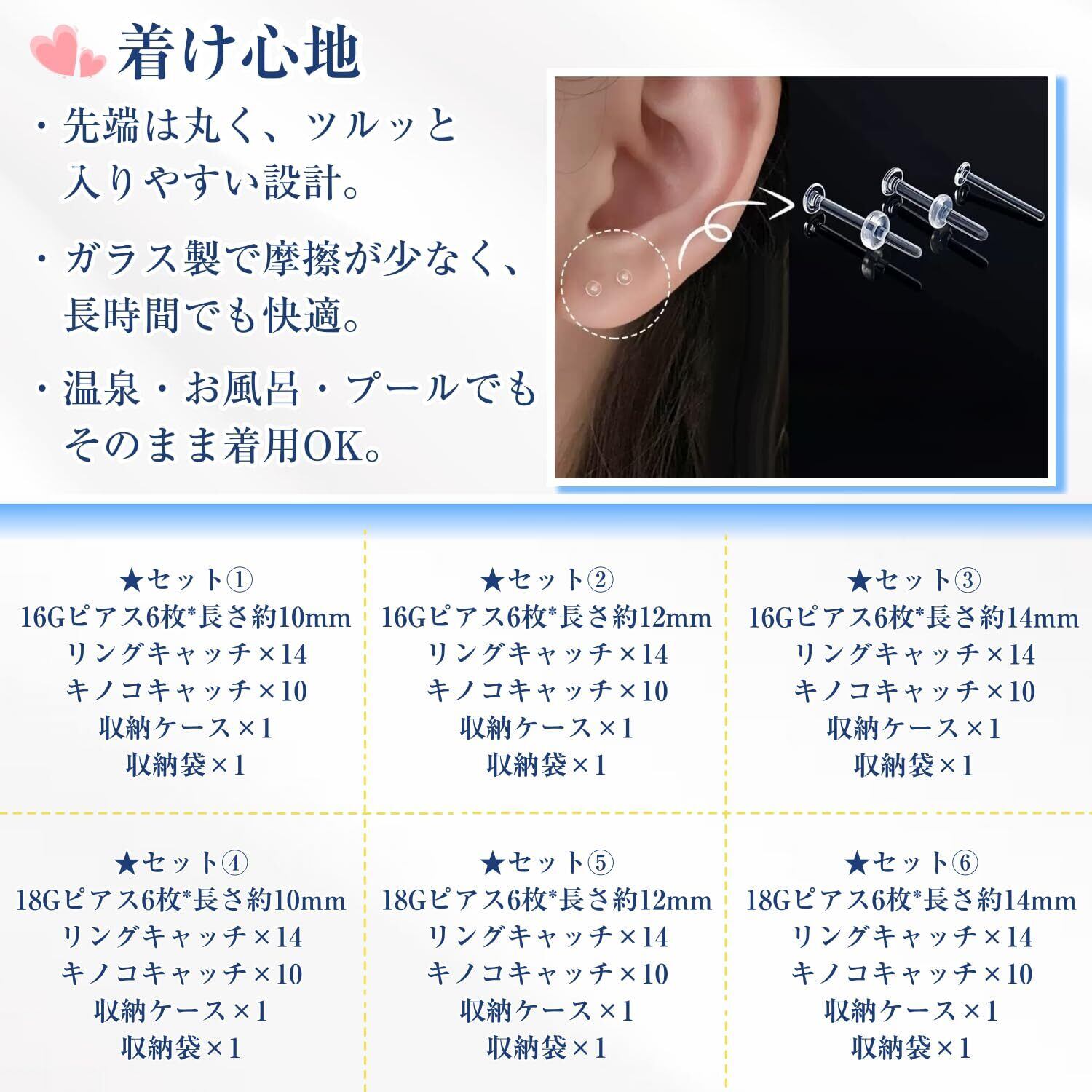【肌に優しく、毎日清潔に使える】透明ピアスはつるんとした表面加工で汚れや皮脂が付きにくく、石鹸水やアルコールで簡単に洗浄可能です。アクリル製より衛生的で変色しにくいため、ファーストピアスやホールケア期間にもおすすめです。お風呂や就寝中もそのまま装着できます。