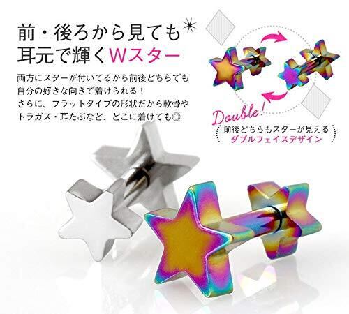 前後どちらから見てもダブルスター!ダブルフェイスデザイン!自分の好きな向きで着けられて、さらにフラットタイプだから耳たぶはもちろん軟骨、トラガスなどどこに着けても◎