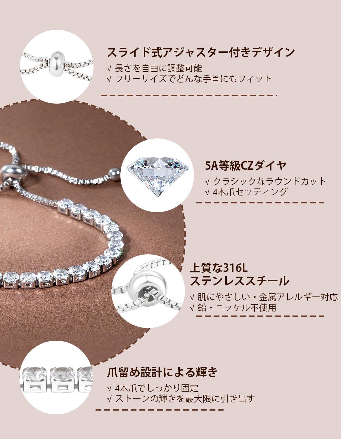 【低アレルギー性 316Lステンレス】高品質な316Lステンレス製のテニスブレスレットです。2層のコーティングにより、肌に優しく、敏感肌の方でも安心してお使いいただけます。長時間美しい輝きを保ち、変色に強く、抗酸化効果が業界基準を上回ります。どんな日常の使用にも耐え、長期間の美しさを楽しめます。