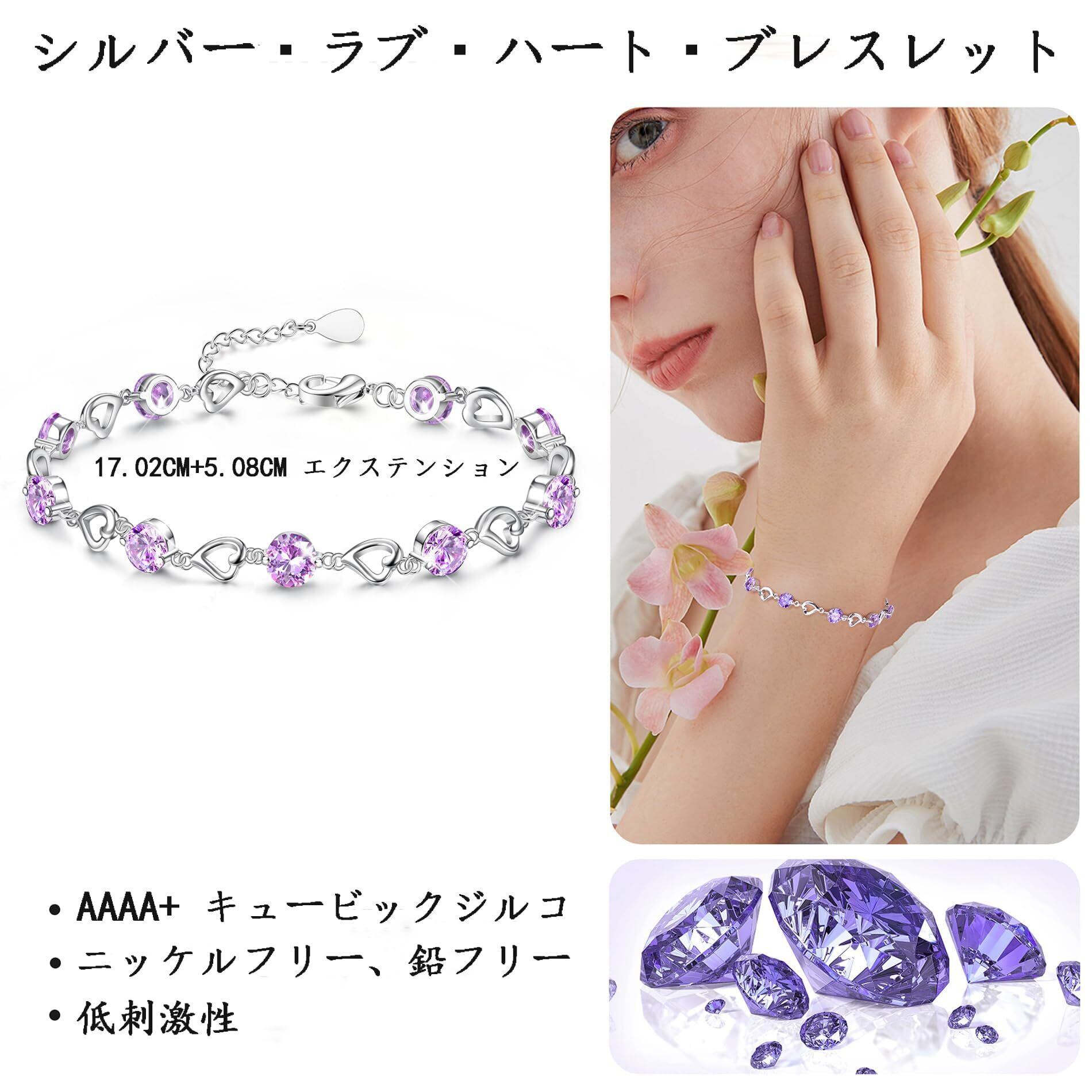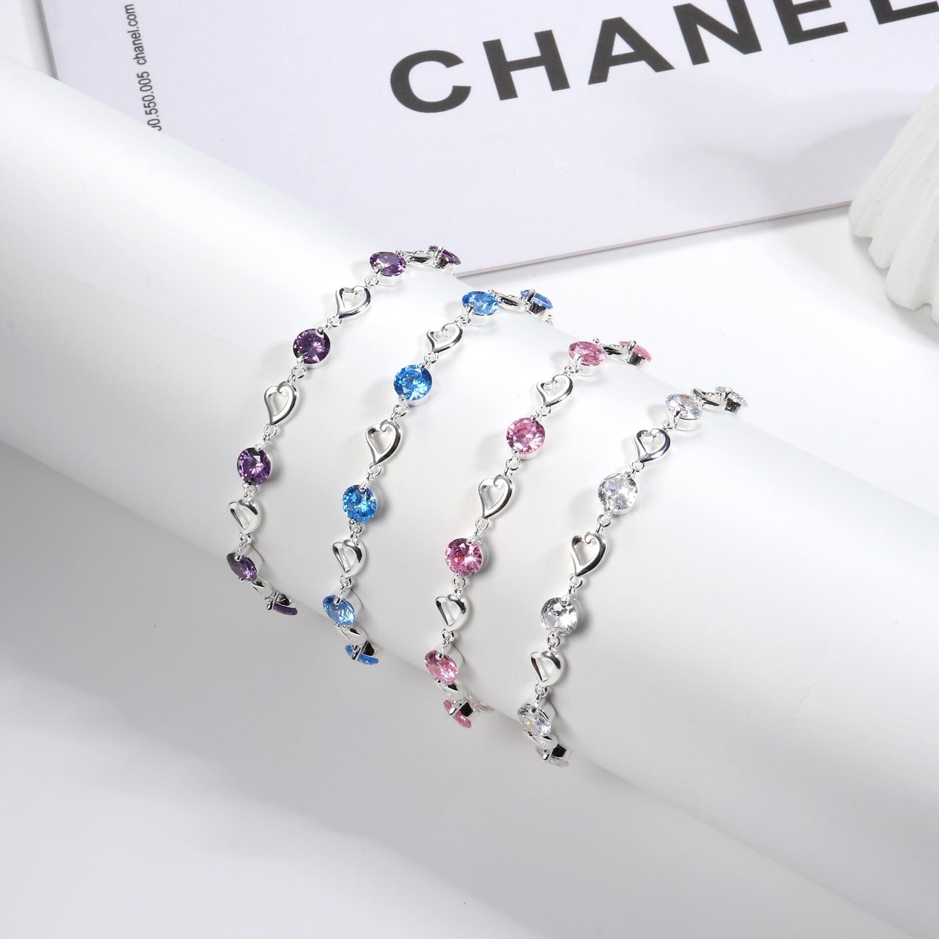 キュービックジルコニア付きハートブレスレット 女性と女の子のための中空のハート型シンボルと、ホワイト、ピンク、ブルー、バイオレットの4色から選べるカラーサークルジルコンを連結させたシルバーブレスレット。9個のキュービックジルコニアと9個のハートシェイプが密接につながり、この極上のブレスレットを輝かせています。