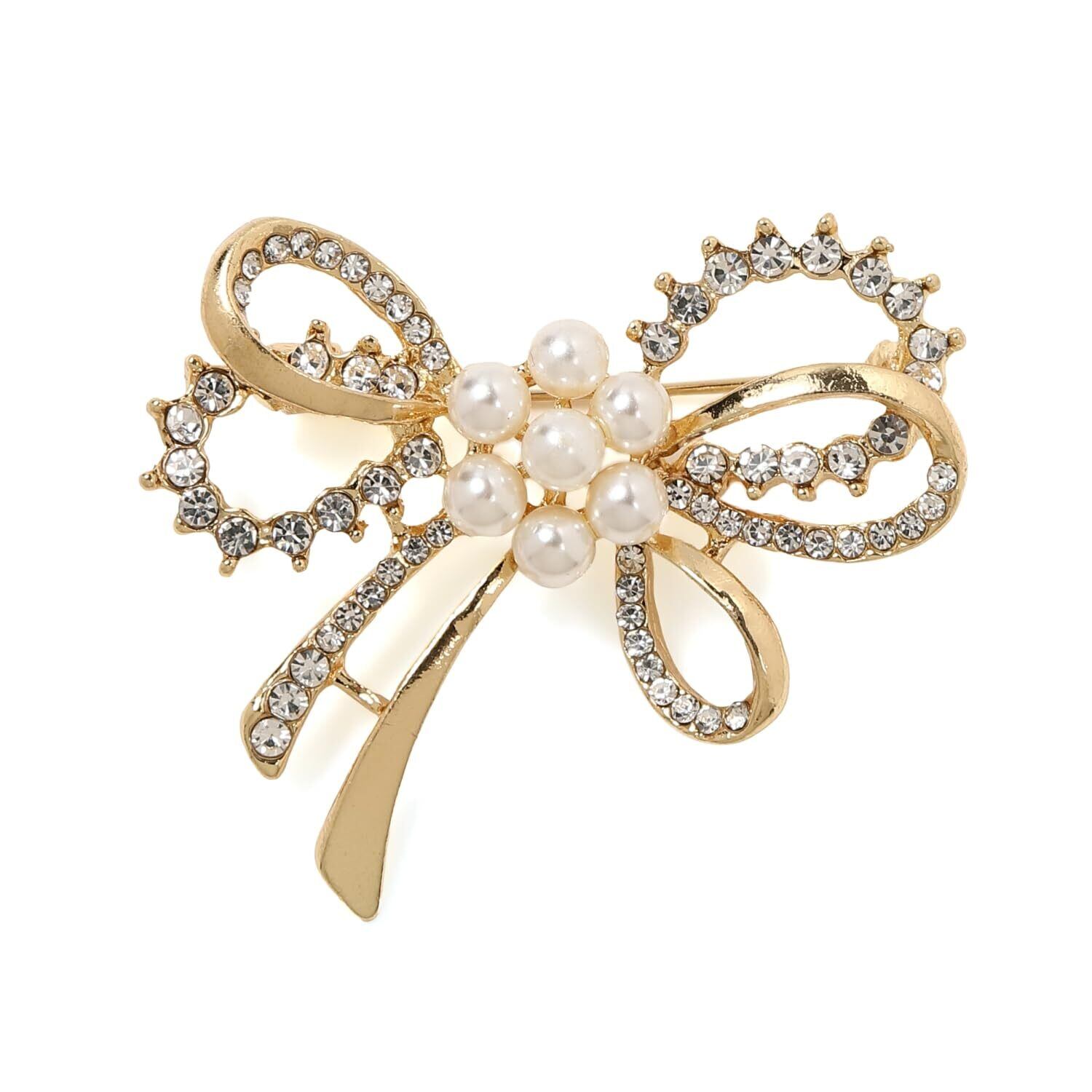 【洗練された小ぶりなデザイン】 全5種類のモチーフから選べる、ピン留めタイプのブローチ。ラインストーンとフェイクパールの柔らかな輝きが、胸元を華やかに彩ります。大きめのブローチやコサージュが苦手な方でも取り入れやすい、主張しすぎない上品なサイズ感に仕上げました。