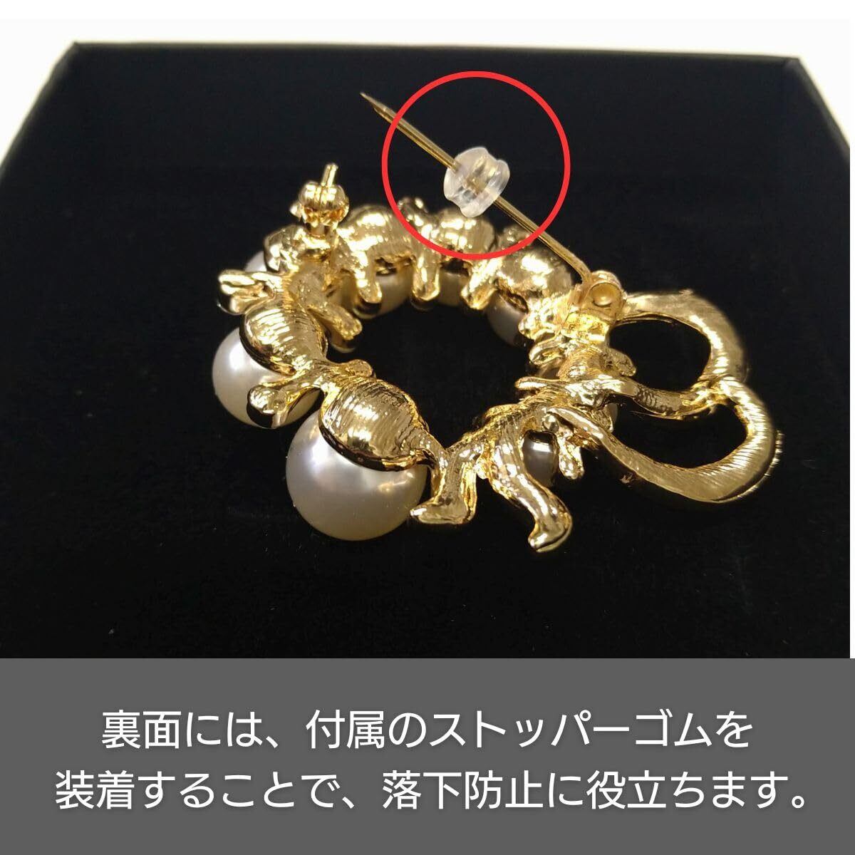 【落下防止ストッパーで安心】 大切なブローチを紛失から守るため、裏面に装着する「ストッパーゴム」を付属。ピンの固定をサポートし、重みによる傾きも抑えられるので、長時間のイベントでも安定した着け心地が続きます。