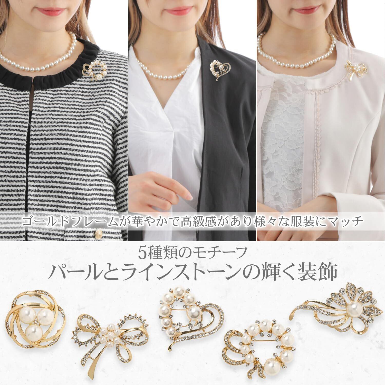 【洗練された小ぶりなデザイン】 全5種類のモチーフから選べる、ピン留めタイプのブローチ。ラインストーンとフェイクパールの柔らかな輝きが、胸元を華やかに彩ります。大きめのブローチやコサージュが苦手な方でも取り入れやすい、主張しすぎない上品なサイズ感に仕上げました。【落下防止ストッパーで安心】 大切なブローチを紛失から守るため、裏面に装着する「ストッパーゴム」を付属。ピンの固定をサポートし、重みによる傾きも抑えられるので、長時間のイベントでも安定した着け心地が続きます。【清楚で落ち着いた大人の可愛らしさ】 派手すぎず、かつ埋もれない、バランスのとれたスタイリッシュなデザイン。シンプルで飽きのこないシルエットは、セレモニーからパーティーまで、大人の女性の気品を引き立てます。様々なシーンのアクセントとして、イベントやフォーマルシーンはもちろんの事、入園式・入学式・卒園式・卒業式・成人式など、スーツやジャケット、ドレスといったコーデなど、様々な場面でお使い頂けます。幅広い年齢層に対応しているので、20代から50代以上まで、世代を問わず幅広いコーディネートにご愛用いただけます。【ギフトに嬉しい専用BOX付き】 大切な方への贈り物や自分へのご褒美に。保管に便利な専用ブローチBOXをセットでお届けします。ブラックを基調としたシックなパッケージが、商品のエレガントな魅力を際立たせます。