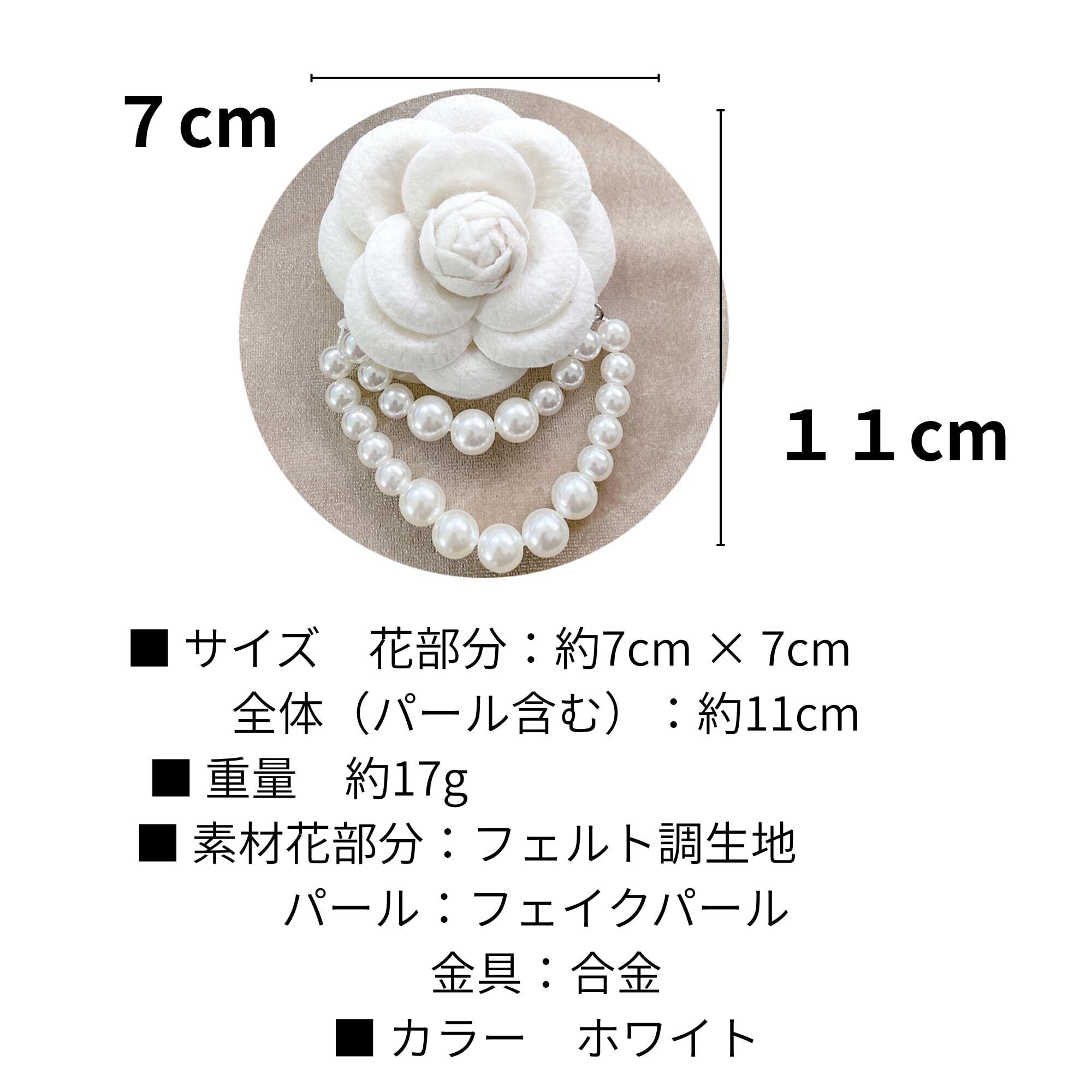 カラー ホワイト(白) サイズ ・花部分:約7cm × 7cm ・全体サイズ(パール垂れ下がり含む):約11cm 重量 ・本体:約17g ・梱包時:約33g 素材 布(フェルト調)、イミテーションパール、金属パーツ 留め具 ブローチピン 付属品 簡易ボックス入り (約9cm × 9cm × 高さ4.5cm)