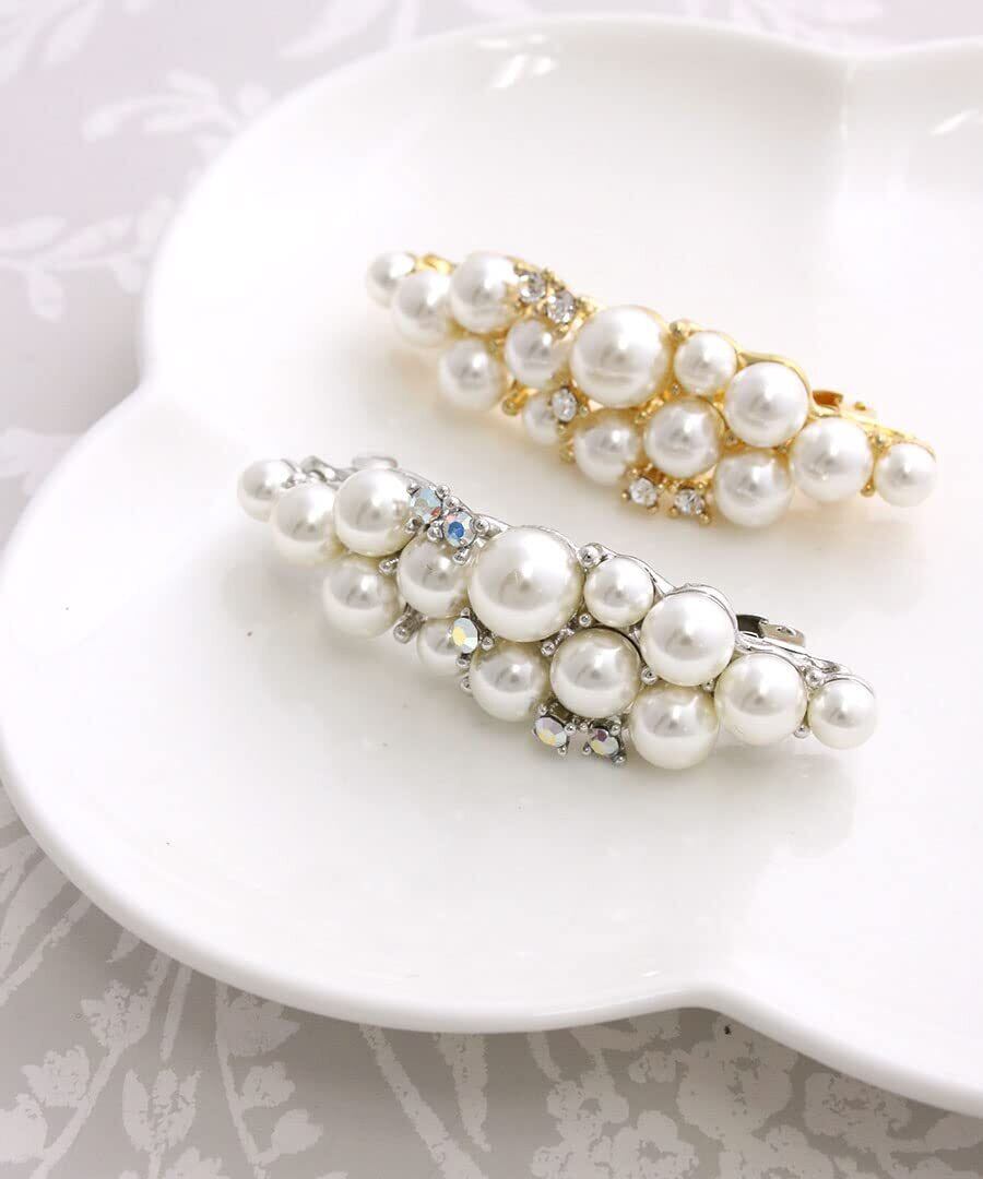 パールやビジューをあしらって、上品な印象漂うバレッタ。小ぶりなサイズ感なので、サイドに留めたりお団子ヘアに添えたりアレンジヘアに活躍してくれそう。デイリーはもちろん、特別な日のお出かけにもお勧めです。取り入れるだけで、普段の服装もぱっと華やぎそう