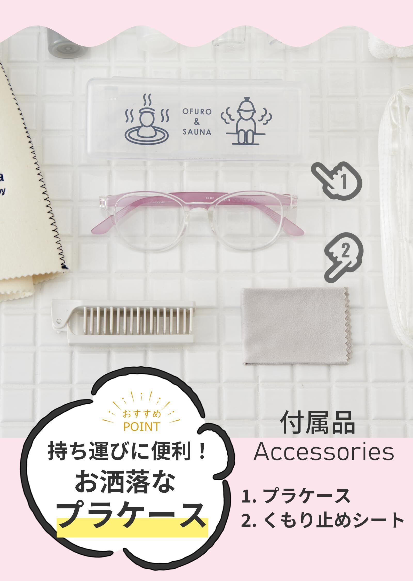 ■サイズ:レンズ幅49mm / ブリッジ幅18mm / テンプル幅140mm ■内容:メガネ本体 / オリジナルプラスチックケース / 曇り止めシート ■濡れてもさびない、曇りにくい、熱にも強い。お風呂・サウナを「安心・安全」に楽しめるように。度入りのレンズで、熱や腐食にも強い。入浴中の見えないを解消。 ■弾力性があり、変形しにくい素材 / 日本人の鼻に合わせたフレーム設計 ■ 防曇コーティングがお風呂・サウナでレンズを曇りにくくする / 付属の曇り止めシートを使えば、落ちてきた防曇コートが復活 ■ES-002 ボスリントン型 / ピンクパープル