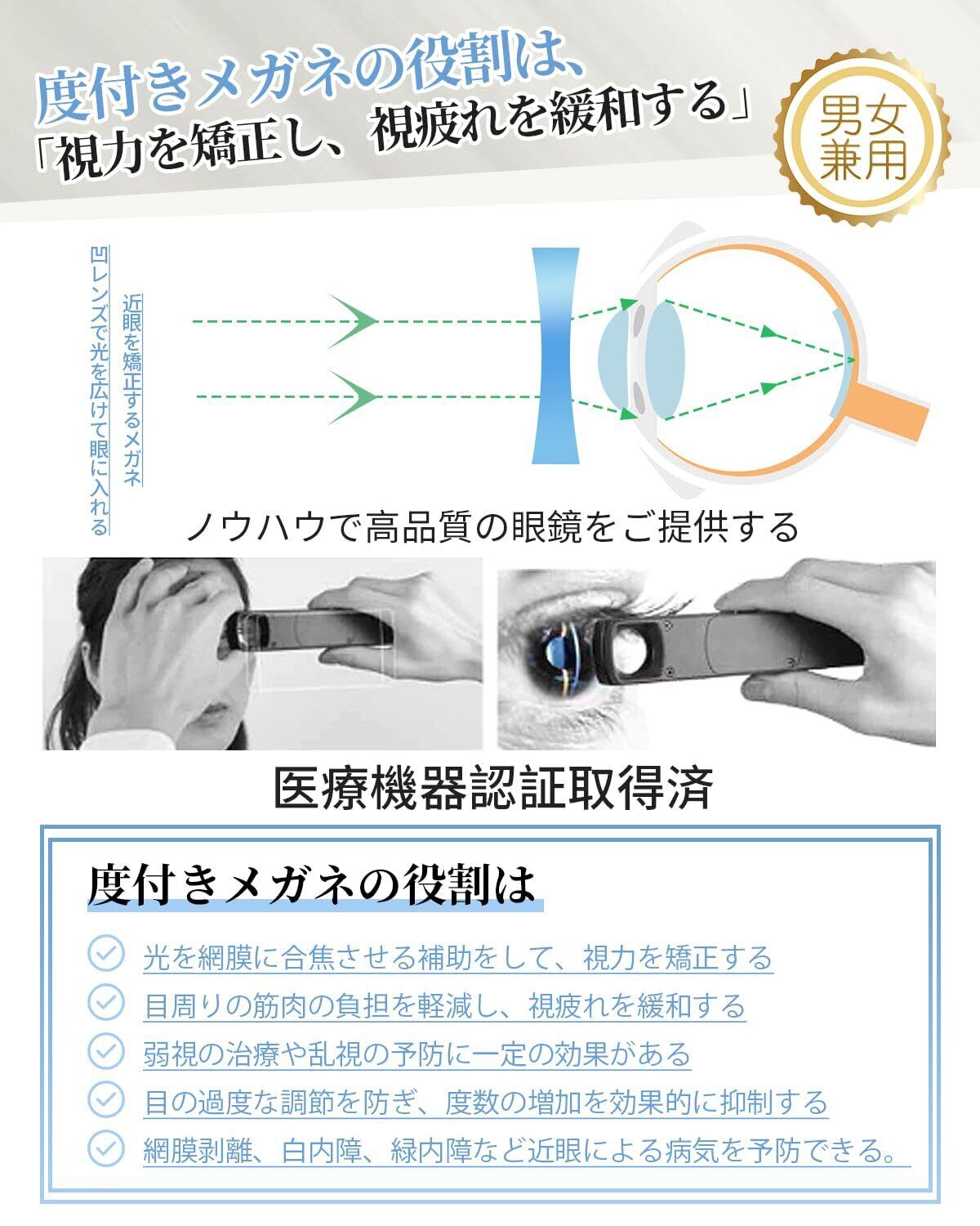 【アレルギー防止&よい掛け心地】近視用 度あり近眼用メガネです。日本人の顔に合わせた立体デザイン設計と金属アレルギーに配慮した設計により、快適なフィット感が実現できます。普段メガネを着用しない方でも違和感なく気楽にかけられます。鼻パットにはソフト素材を採用し、滑りにくく、長時間掛けても 鼻にはセキを残さず、鼻への負担も軽減してくれます。