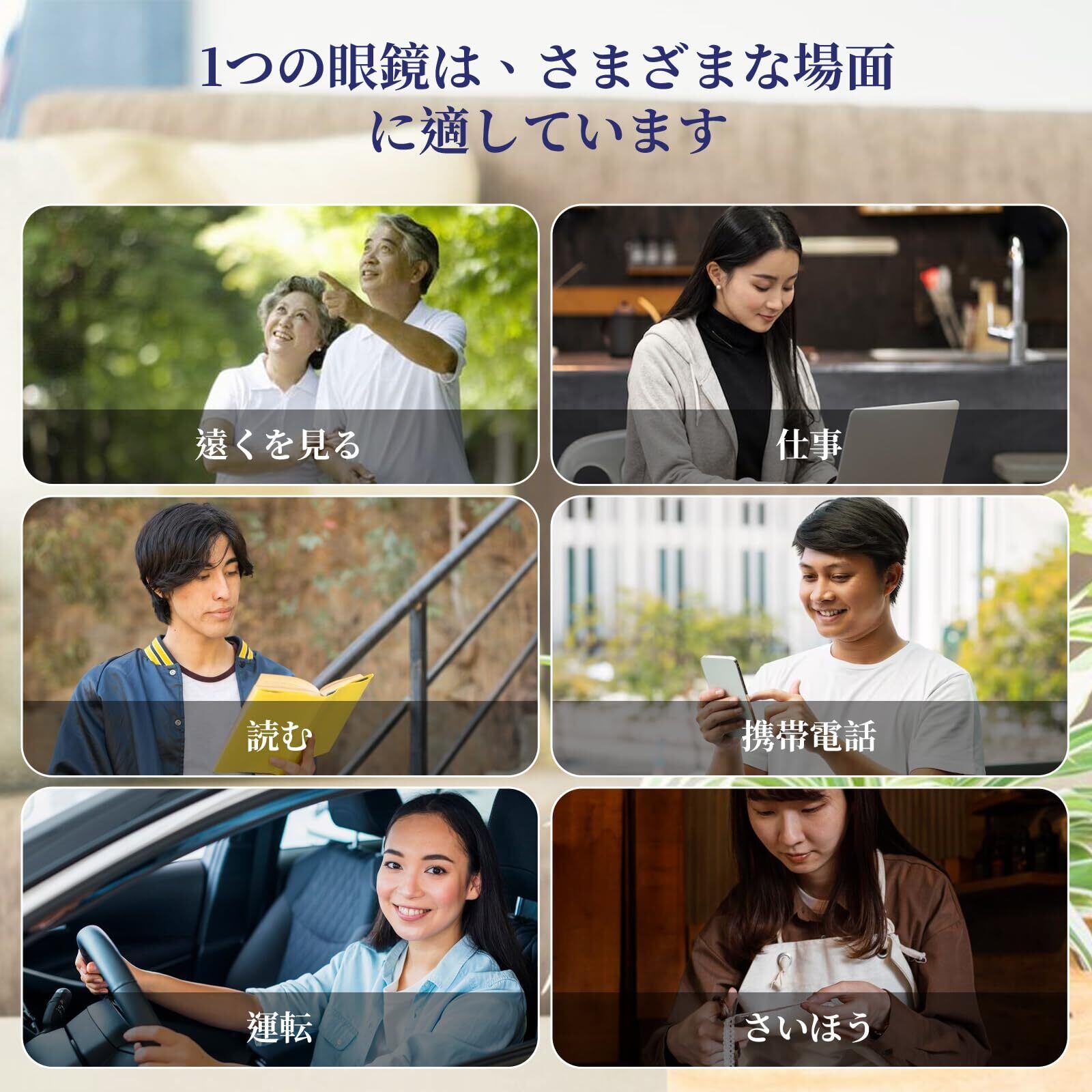 遠近両用眼鏡►人は40代くらいから目の調節力が衰えていき、近くのものが見えにくくなります。近くを見たいときは、眼鏡をかける必要があります。遠近両用メガネは両手を解放するデザインで、持続的に眼鏡を外すのを避け、つける。メガネをかけると下を見るだけで近くが見え、遠くを眺めるときは平視するだけで、通常のブルーレイメガネのように機能します。