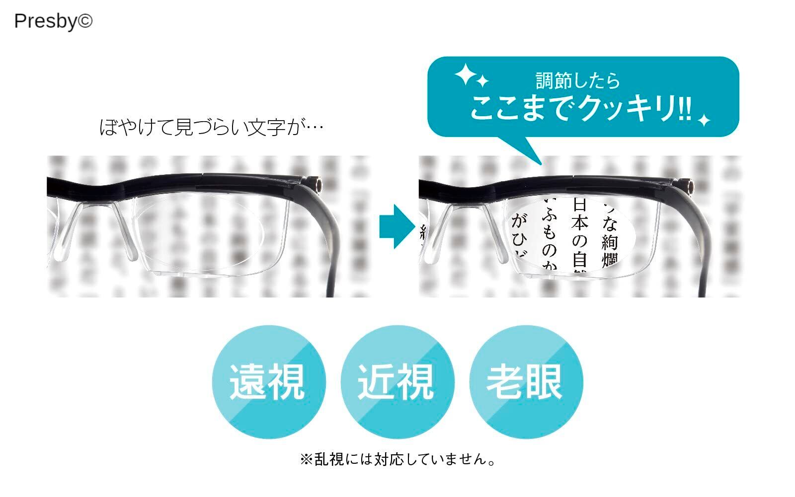 度数調節機能付きで、ご自分の視力に合わせて片眼ずつ度数調節ができます(適用度数 -4.0D~+5.0D)。遠視・近視・老眼の全対応メガネで買い替え不要、これ一本でOK!