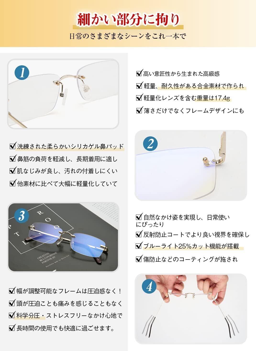 「リムレス 老眼鏡」おしゃれなリムレス老眼鏡は知的な印象を与えられるデザインにより、高い意匠性から生まれた高級感を持っている老眼鏡です。それに、軽量化したレンズの光透過率も非常に優れています。サイズ:フレーム横幅133mm、ブリッジ23mm、レンズ高さ32mm、レンズ幅52mm、テンプル141mm
