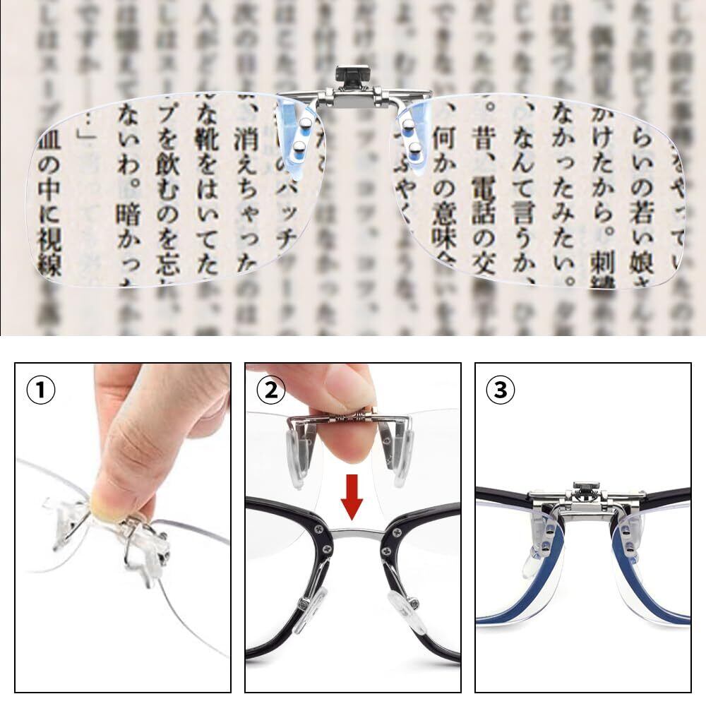 【簡単着脱】クリップ式でお使いの眼鏡に挟みこむだけで老眼鏡に変わる!跳ね上げ式なので、お使いにならない時に片手で簡単には跳ね上げて、掛け外しは不要でとても便利です。