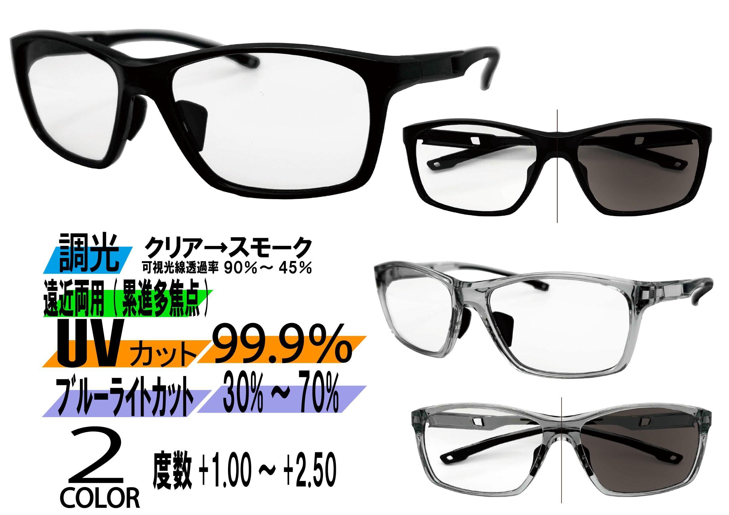 軽く柔らかいTR90素材のスポーティーでかっこいい調光シニアグラス(老眼鏡)!!紫外線99.9%以上カットはもちろんブルーライトをクリア(遮光時)30%→スモーク(露光時)70%カット!!