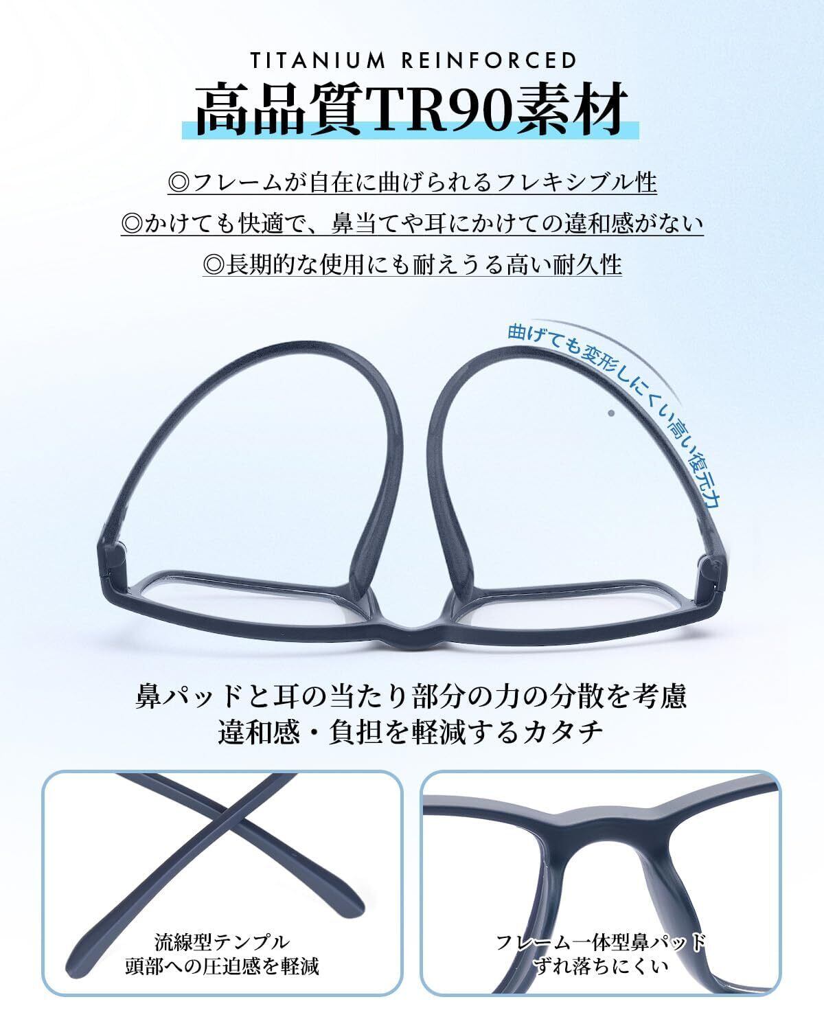【超軽量10gのTR90フレーム】 老眼鏡のフレームは、超軽量のTR90素材を使用しています。わずか10gと持ち上げた感覚がないほど軽く、長時間の装用でも疲れにくいデザインです。耳かけや鼻パッド部分にかかるストレスを軽減し、長時間の装着感を向上させています。また、耐衝撃性にも優れているので、誤っての落下などにも強く安心して使用可能です。