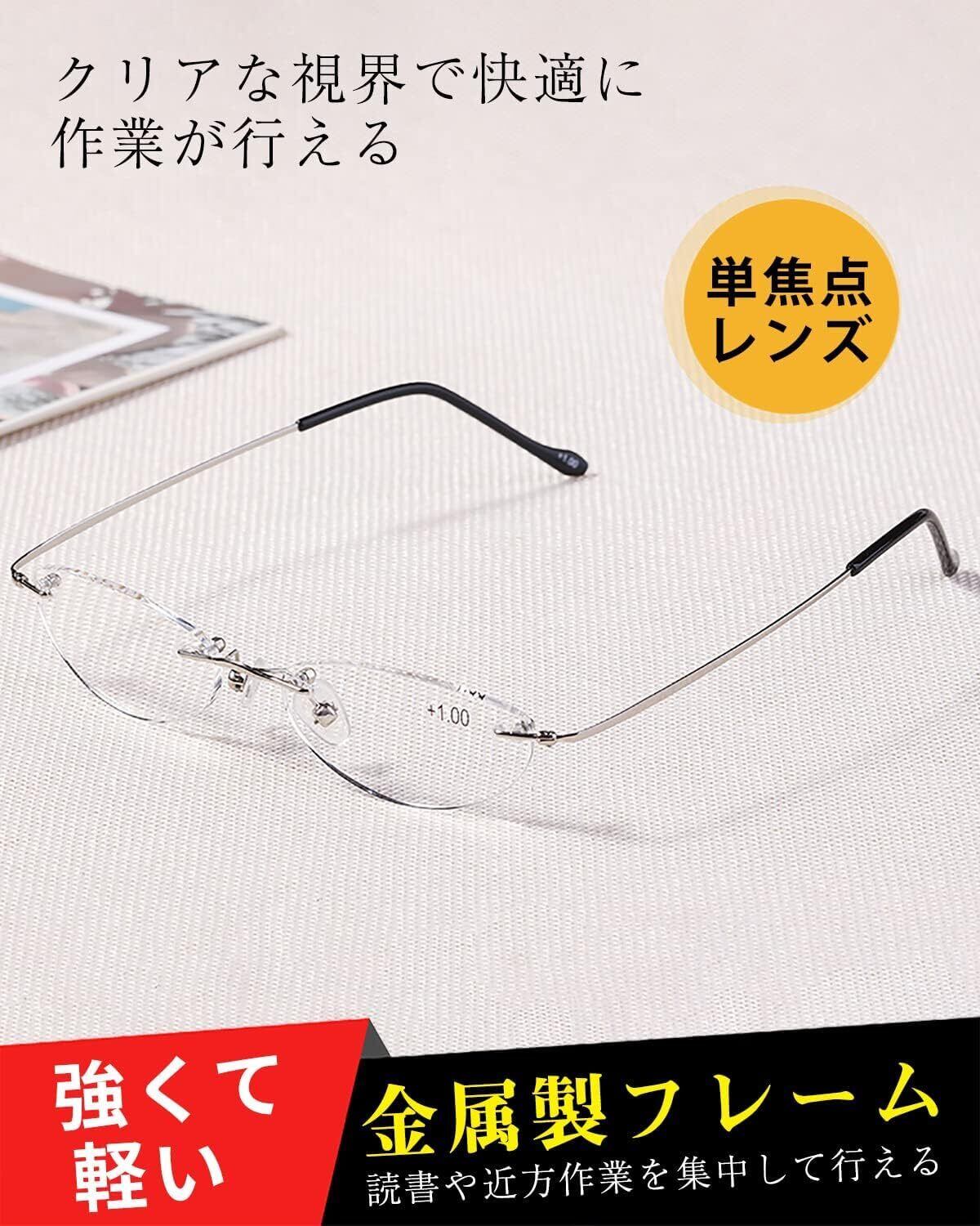 老眼鏡 無色レンズ リーディンググラス 縁なし 透明 シニアグラス 掛けやすい ケース付き メンズ レディース おしゃれ コンパクト ステンレスフレーム 高性能 プレゼント +1.0~+3.0 型番:77705