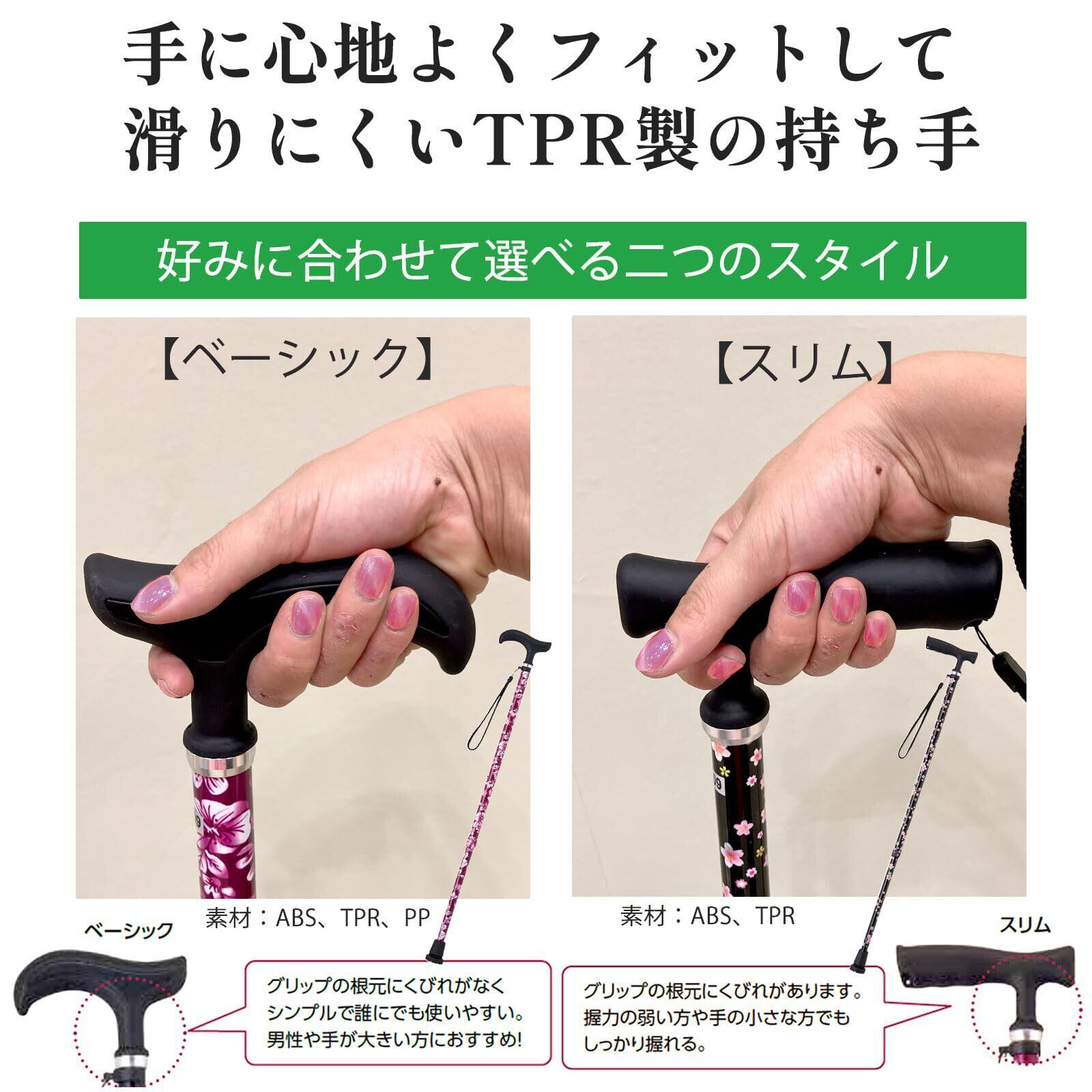 【手に心地よくフィットする持ち手】好みに合わせて選べる二つのスタイル。ベーシックはグリップの根元にくびれなし。パイプ径:手元21mm/杖先19mm。スリムはグリップの根元にくびれがあり手の小さな方にも握りやすい。パイプ径:手元19mm/杖先16mm