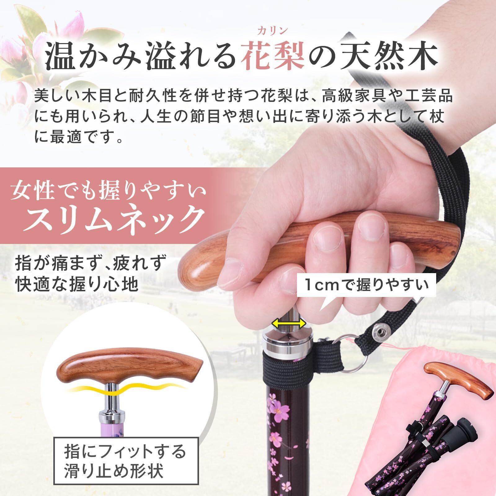 天然木・花梨のぬくもりを手元に感じる、花言葉を添えた上品な杖「結花(ゆいか)」。硬く粘り強い花梨を使用したグリップは、使い込むほどに艶が増し、人生に寄り添う一本へと育ちます。手の小さな方にも握りやすいスリムネック設計で、指にフィットする形状を採用した女性用モデル。約320gの軽量設計ながら耐荷重115kgを実現し、安心してお使いいただけます。突起と溝を施した杖先ゴムが地面をしっかり捉え、SGマークも取得。外出時の持ち運びに便利な折りたたみ式で、バッグに収まるコンパクトサイズ。長さ76〜86cmの5段階調整で身長146〜168cmに対応します。藤・胡蝶蘭・桜それぞれの花言葉をあしらった専用箱と収納袋付きで、母の日や誕生日など大切な方への贈り物にも最適。理学療法士・医学博士が企画開発し、1年間の返品で購入後も安心です。