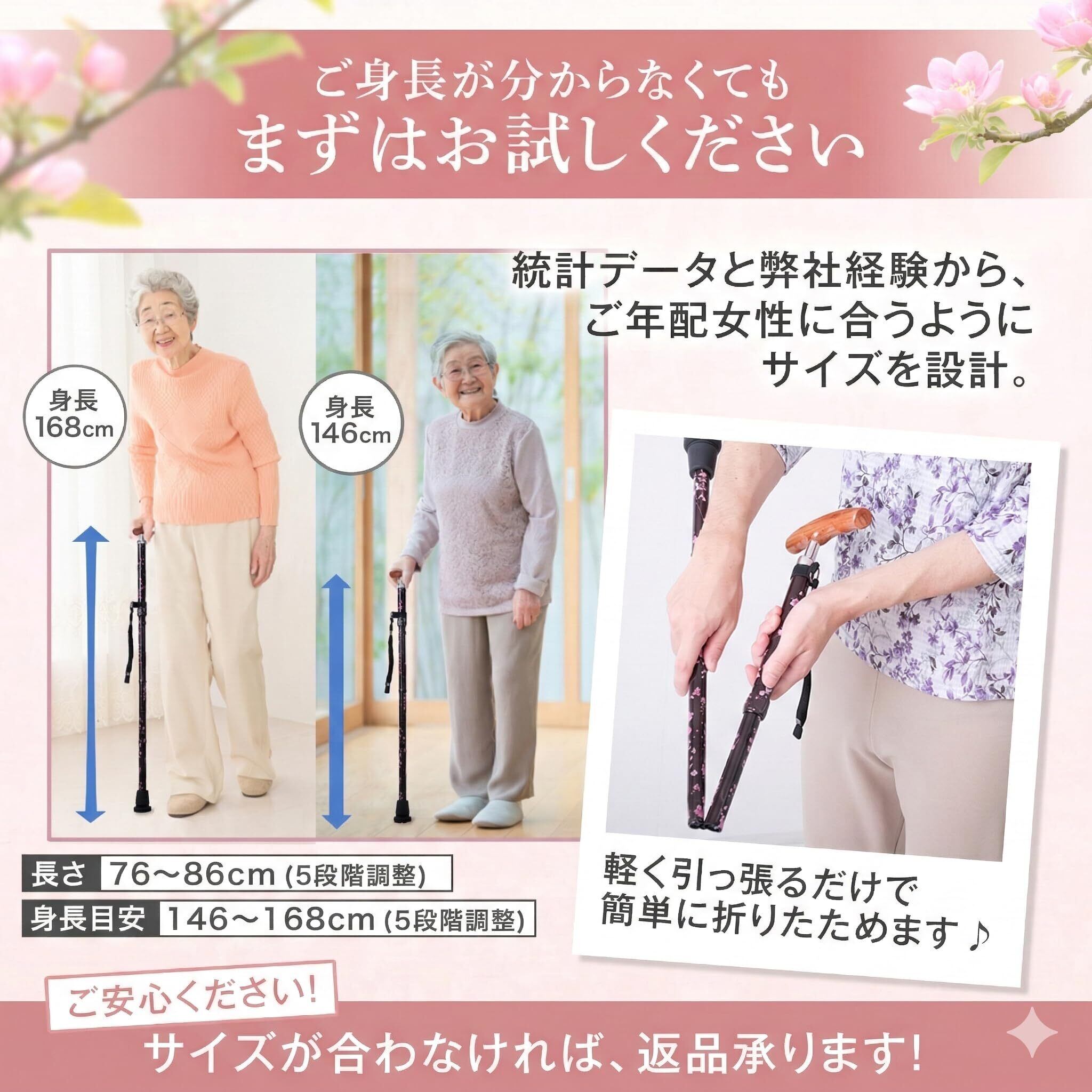 SGマーク取得で安全性も確保:耐荷重115kgに加え、杖先は突起と溝を施した滑り止めで地面をしっかり捉えます。外出時の持ち運びに便利な折りたたみ式で、バッグに収まるコンパクトサイズ。長さ76〜86cmの5段階調整で身長146〜168cmに対応します。