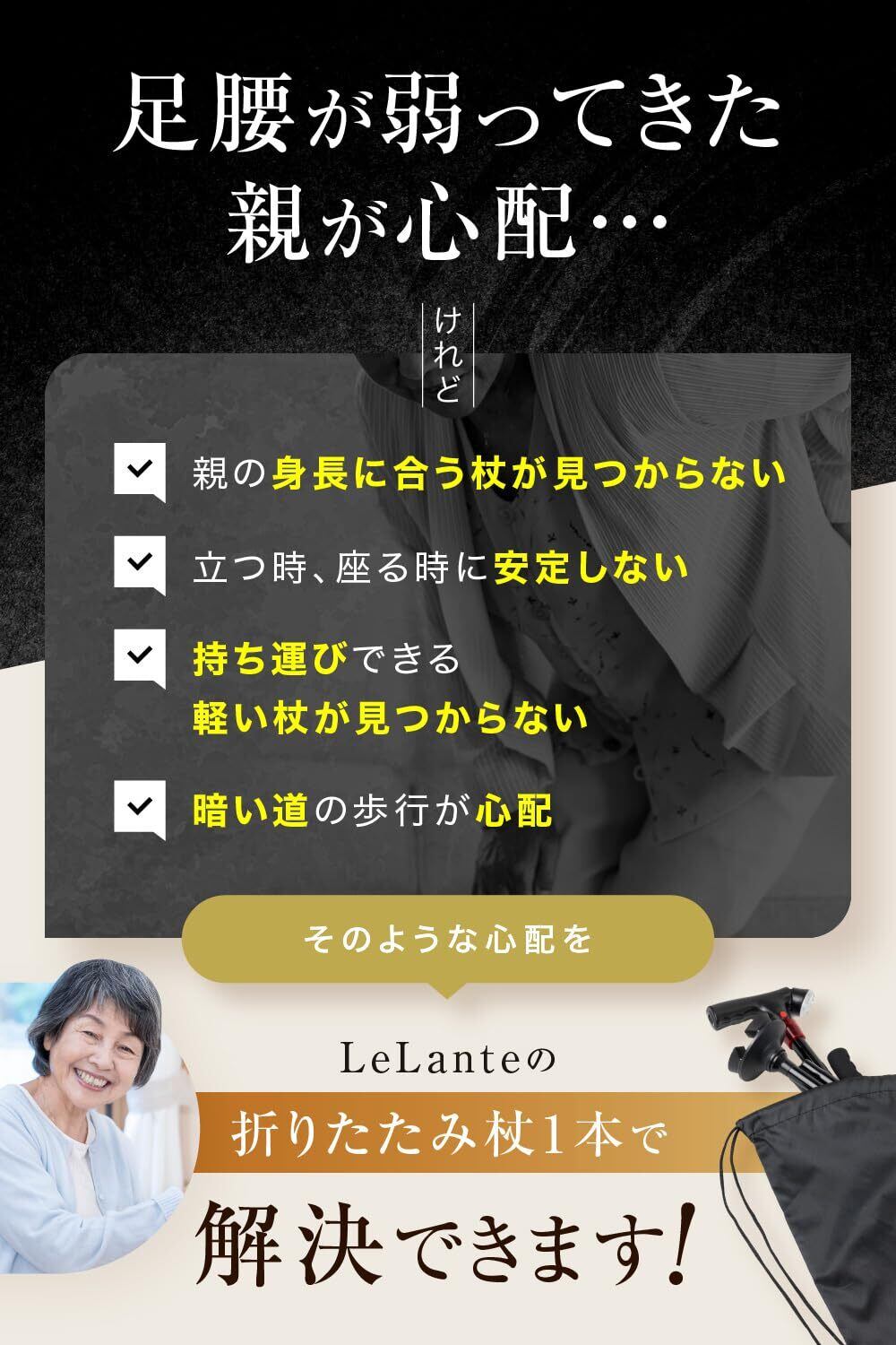 【こだわり】様々なメーカーから 杖 や 折りたたみ杖 が販売されていますが、LeLanteの 4点杖 は使いやすさが一味違います。同じような見た目でも使いやすさが異なるため10社以上の工場で1つ1つ比較を行い、1番優れた技術を持った工場でのみ製造を行っております。