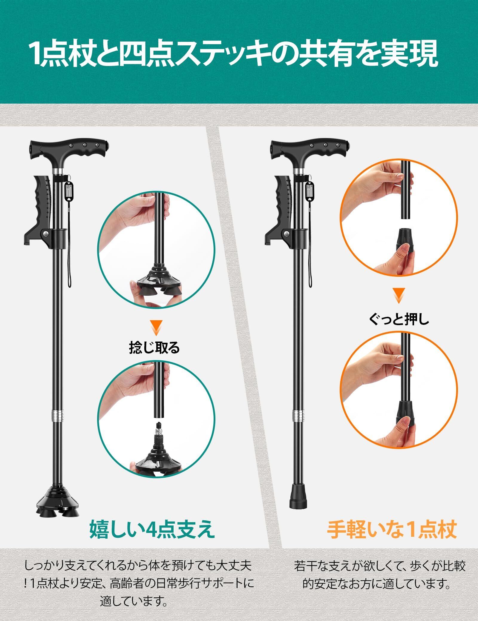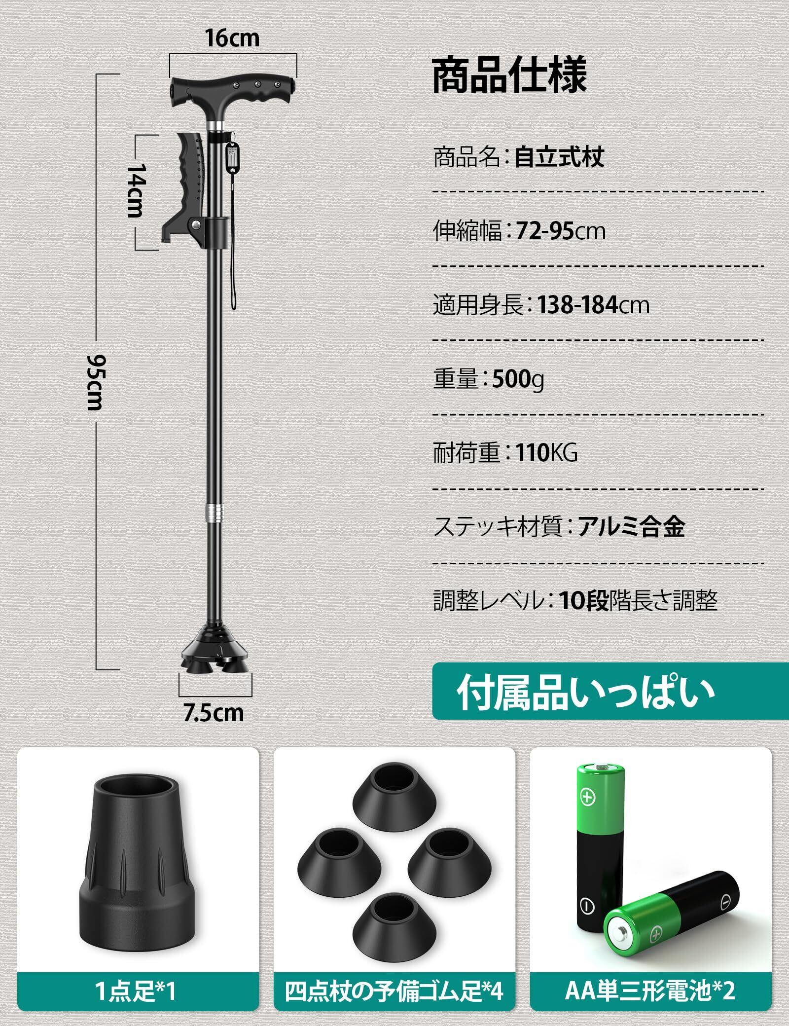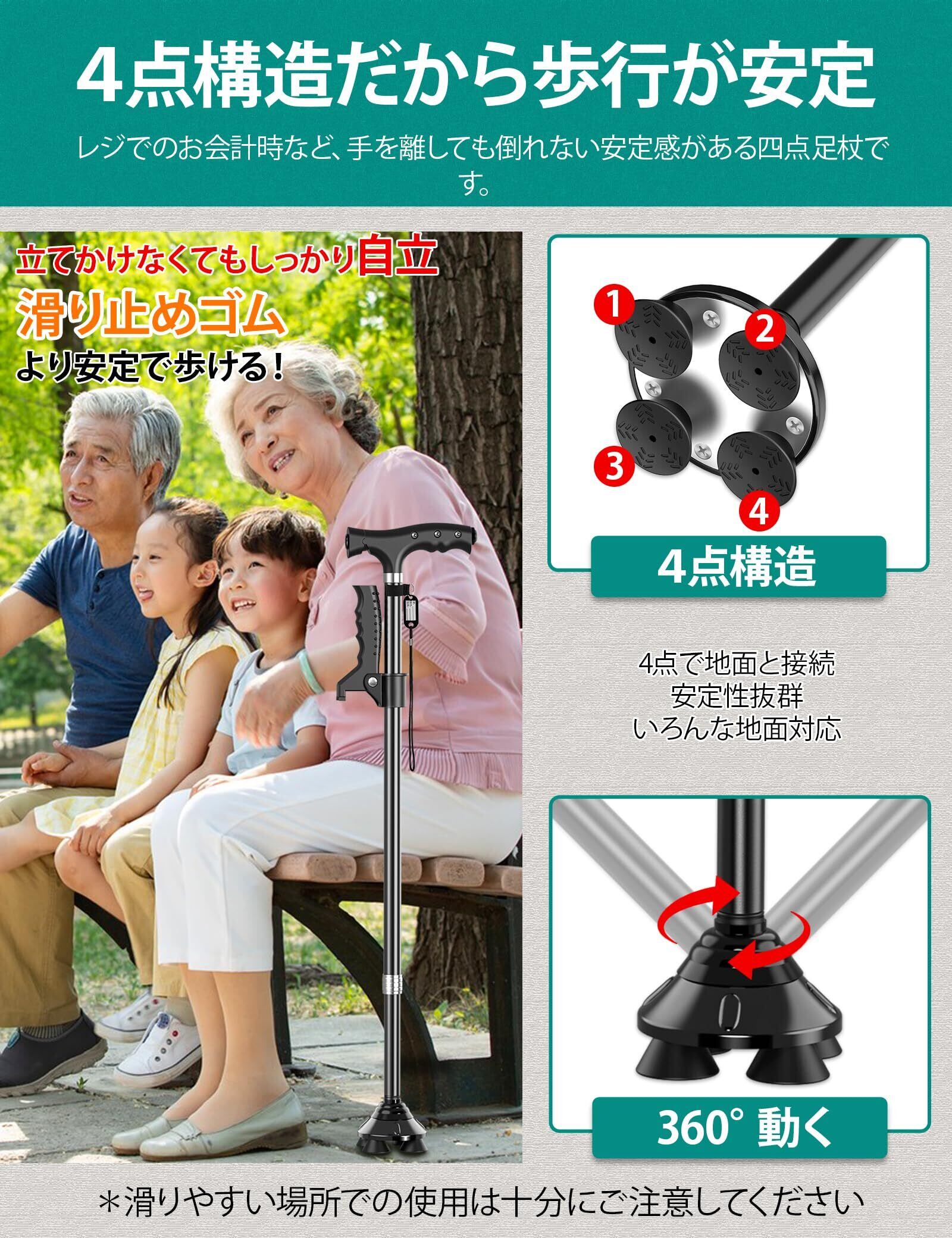 親にプレゼントにピッタリ:この立ち上がり楽々アルミ製4点杖は高齢者への介護に、母の日・父の日・敬老の日等にプレゼントをとしてはぴったりです。【パッケージ】折りたたみ杖x1、電池x2、日本語説明書x1 。期間内に万が一問題がありましたら、ご遠慮なく当社まで連絡してください。