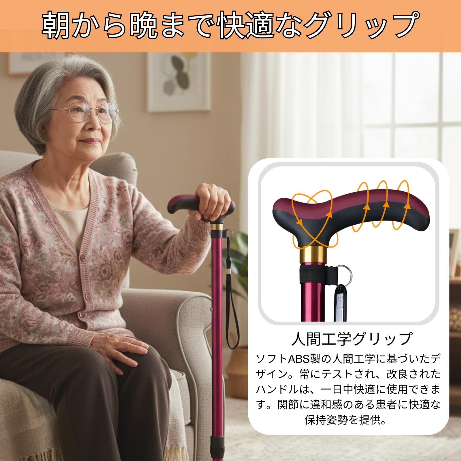 高齢者杖-10段階の高さ調節:5段階や7段階の調節可能な杖と比べて、10段階調節可能な杖は、高さの調節がより精密に行え、使用者に最適な快適さとサポート効果を提供します、転倒リスクを軽減し、全体的な安全性を向上させます。独立式の杖は、身長が142センチから188センチの人に適しています。調節ボタンを押して支柱をスライドさせることで、身長に合わせて杖の長さを63~90センチに調節できます。杖 男性用の長さは、身長に応じて2.5センチ単位で調節できるため、ほとんどのアジア人男性および女性に適しています。