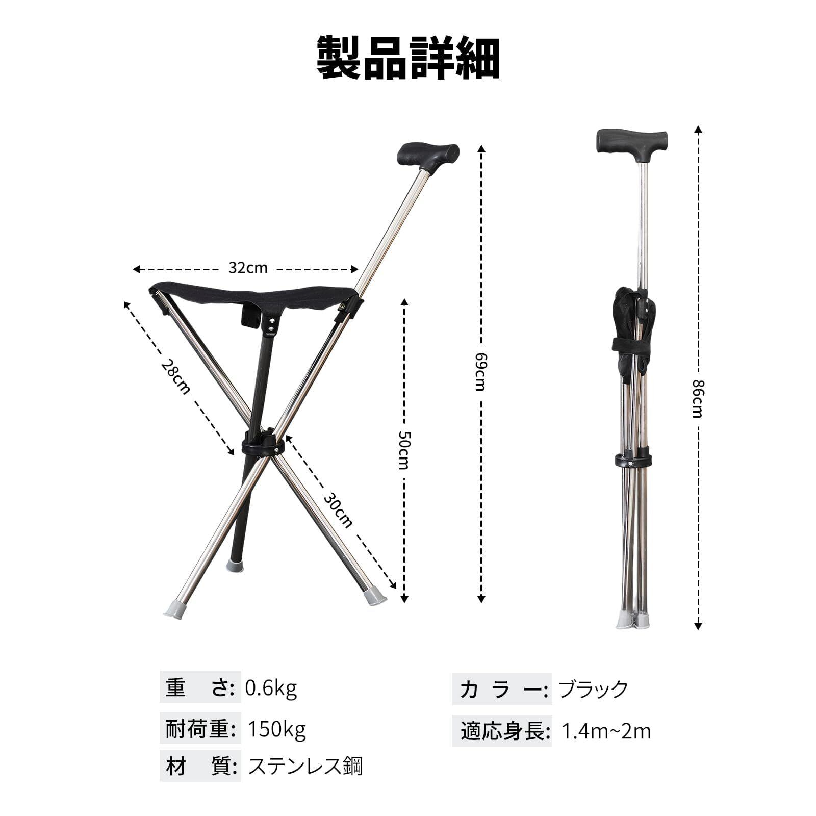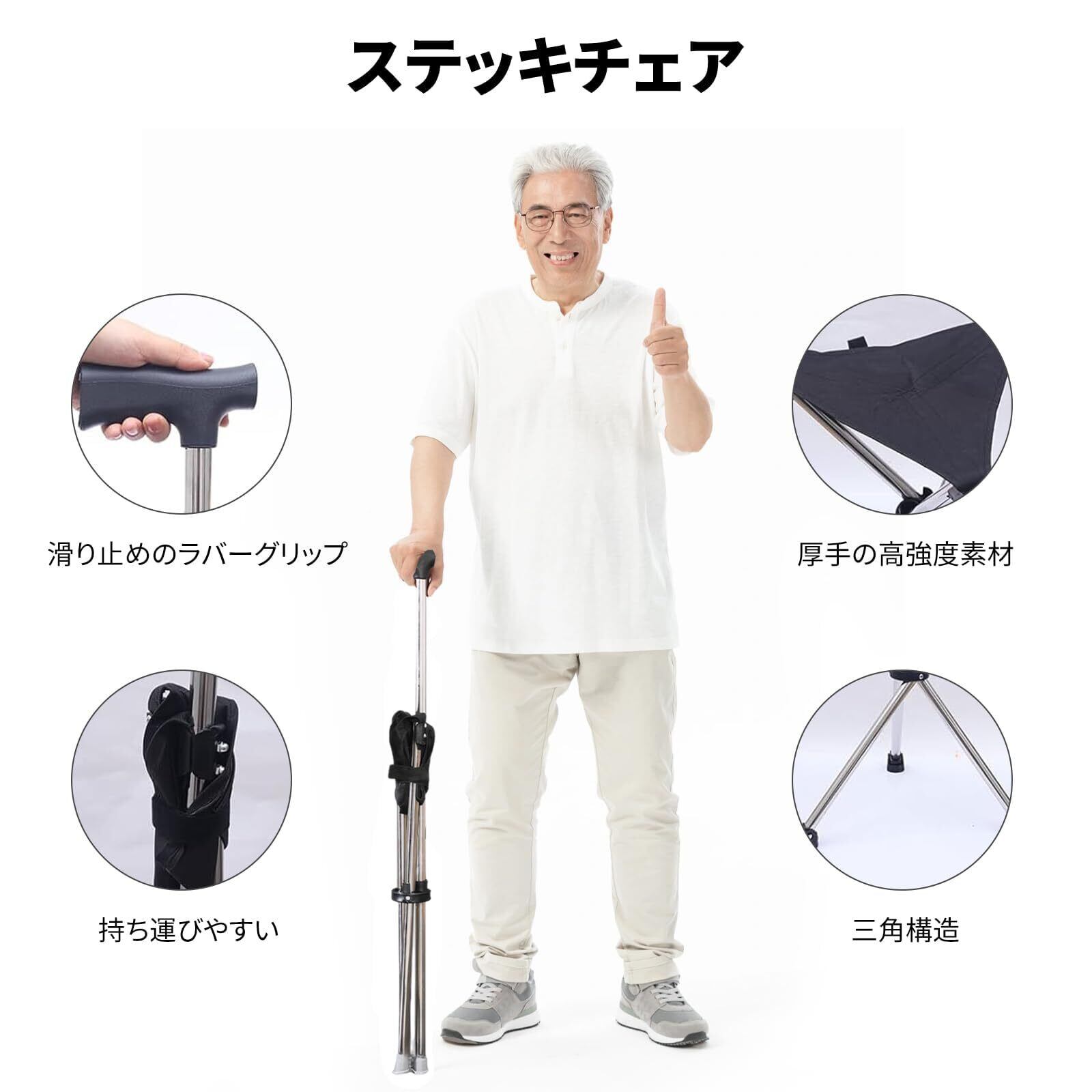 【椅子になる杖のデザイン】この歩行補助杖は滑りにくいハンドルとゴム製の滑り止めパッド付きの3脚を装備、湿った路面でも安定した使用が可能です。高齢者でも安心してご使用いただけます。