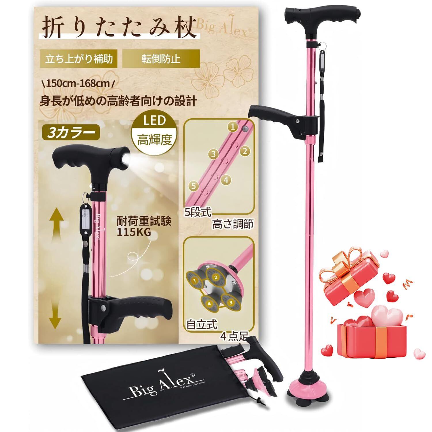 ビグアレクス(BigAlex)杖 4本足 4点杖 折りたたみ杖 つえ ステッキ 補助ハンドル付き LED ライト 自立式 倒れない 軽量 アルミ 折り畳み 伸縮 長さ調整可能 高齢者 男女兼用 介護 歩行支援 夜間散歩 母の日 父の日 敬老の日 プレゼント