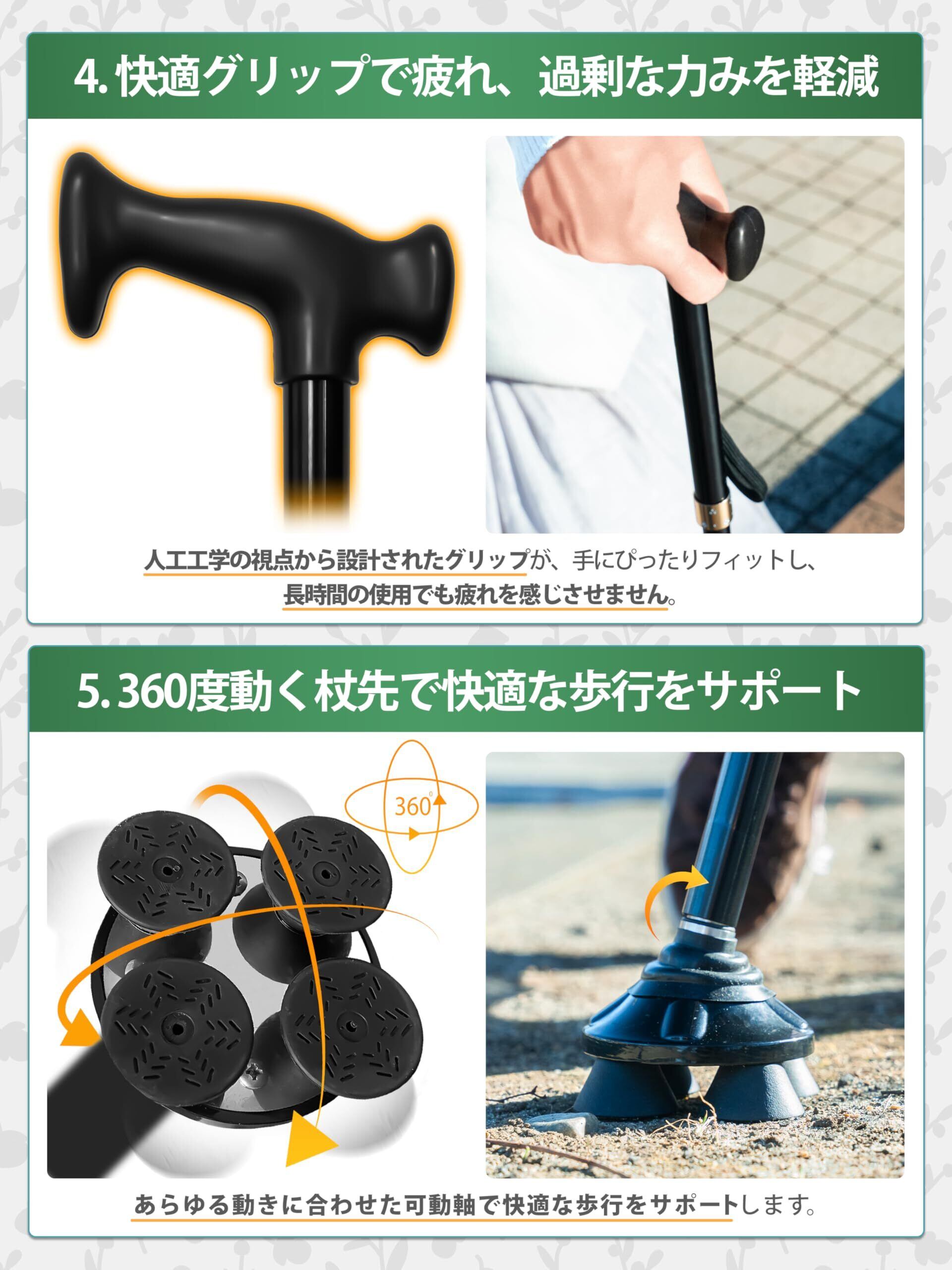 【 人工工学に基づく快適グリップ】 手の形にフィットする人工工学デザインのグリップを採用。握りやすく、長時間の使用でも手が疲れにくい快適設計です。手の負担を軽減し、日々の歩行をより快適にします。
