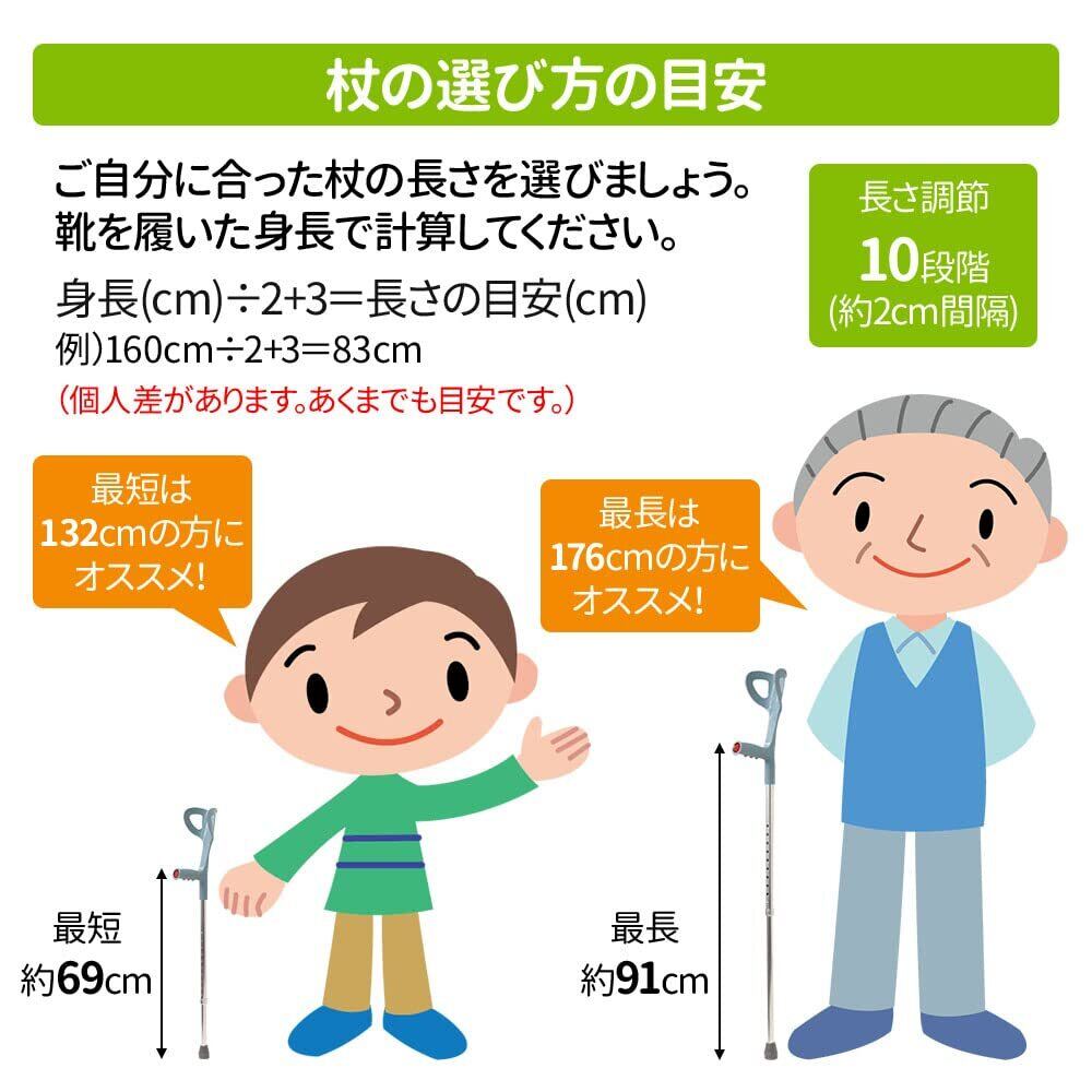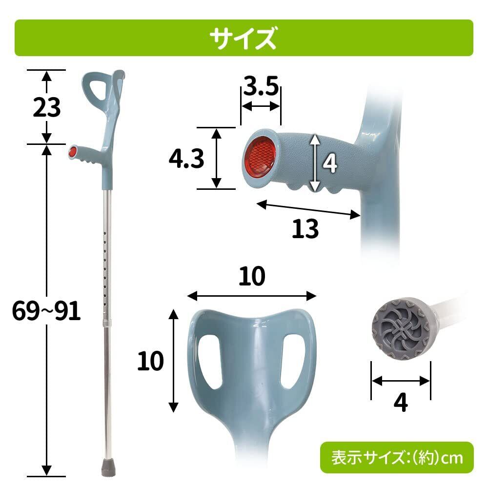 【商品詳細】サイズ(約):地面からグリップまで/69~91cm(10段階調節、約2㎝間隔)グリップからアームカフまで/23cm/パイプ直径/上部:2.1cm、下部:1.8cm/重量(約):382g ※非課税対象(福祉用具)