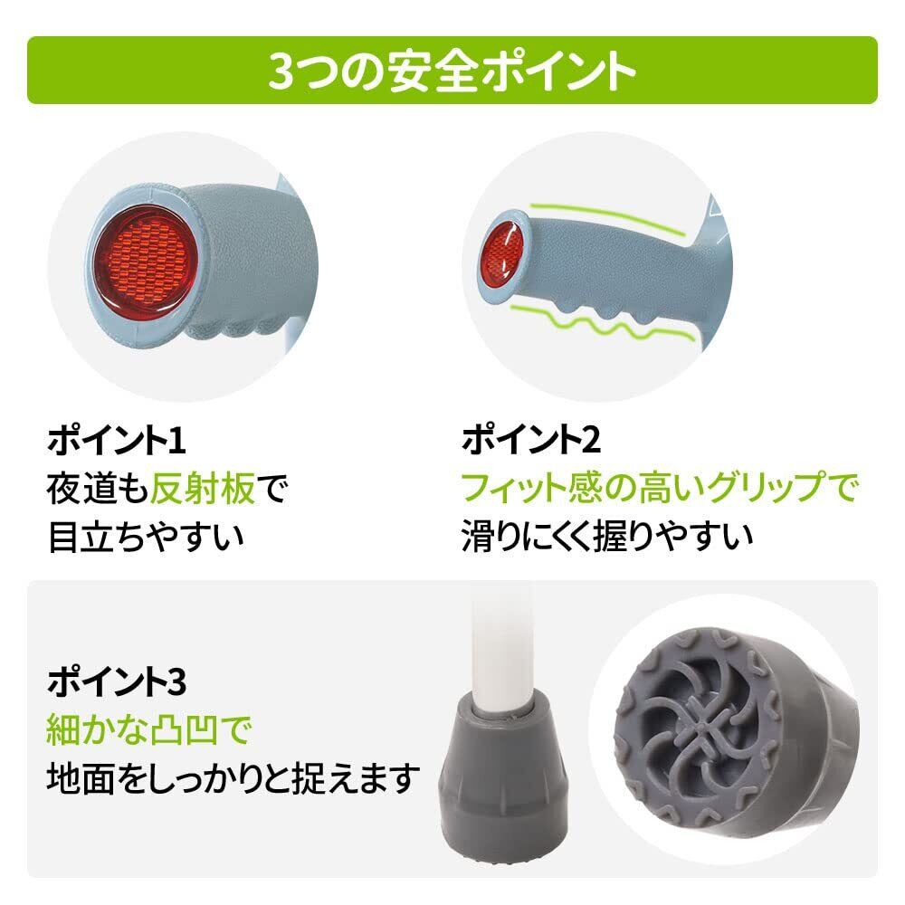 手のひらと腕に体重を分散し二点でささえるので、安定感があり動きやすい杖です。