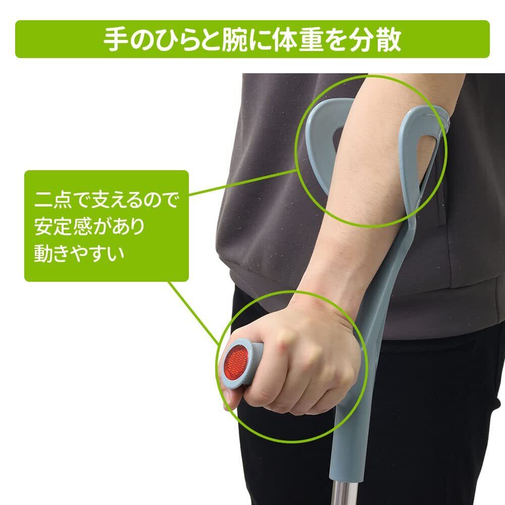【肘までしっかり支えて安心】手のひらと腕に体重を分散し二点でささえるので、安定感があり動きやすい杖です。