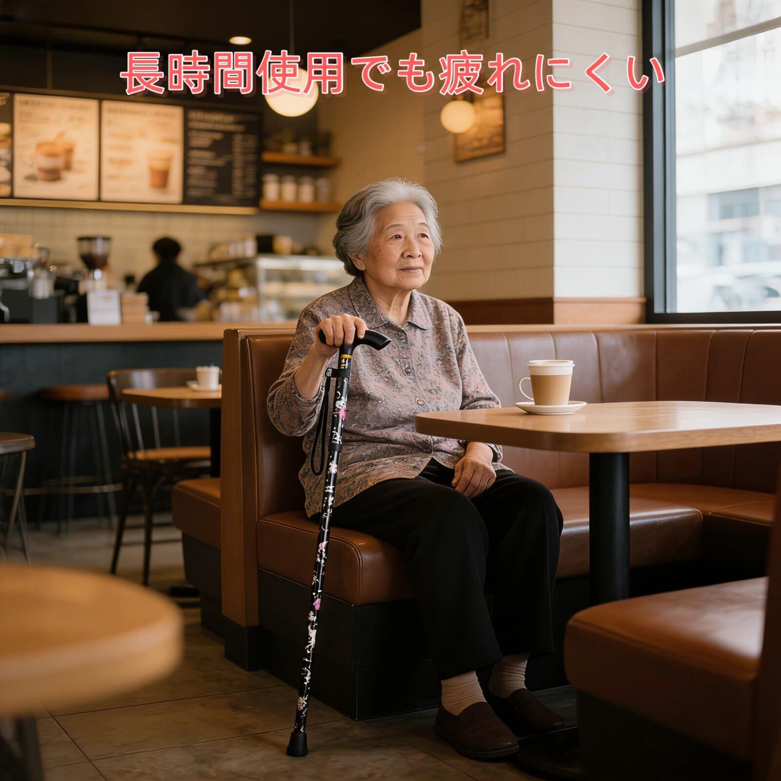 当社の杖は、軽量なアルミニウム合金を使用しながらも、しっかりと体重を支える強度を実現。握り部分は手になじむソフトグリップ採用で、長時間の使用でも疲れにくい設計です。シンプルなボタン操作で簡単に折りたためるので、車でのお出かけや収納にも便利。ブラック花柄、ブルー花柄、パープル花柄の3色から、お母様、お祖母様、お父様・お祖父様のお好みに合わせてお選びいただけます。