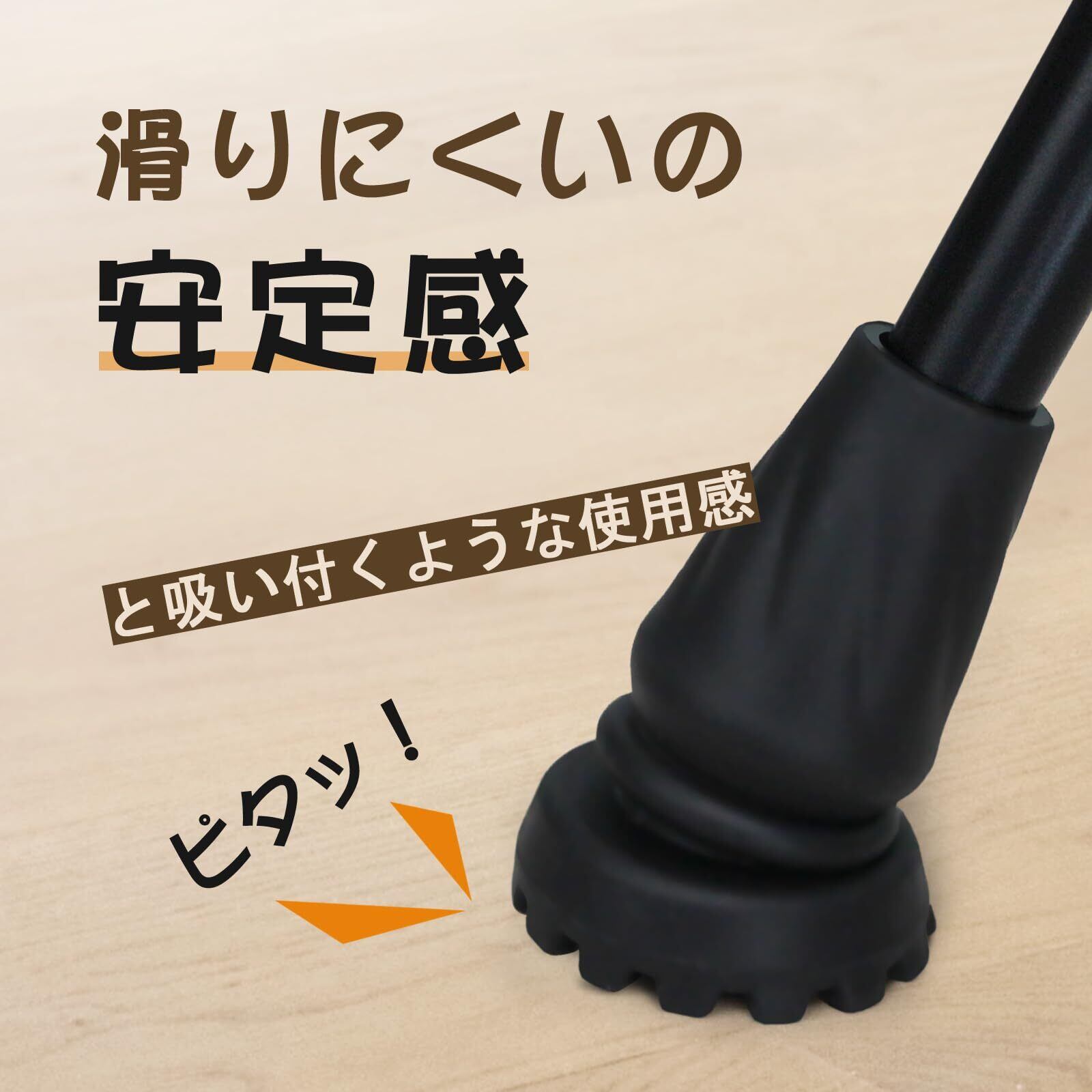 安定感あり:接地面が5cmで幅広く、吸い付くの良い。杖先ゴムで安定感を確保します。