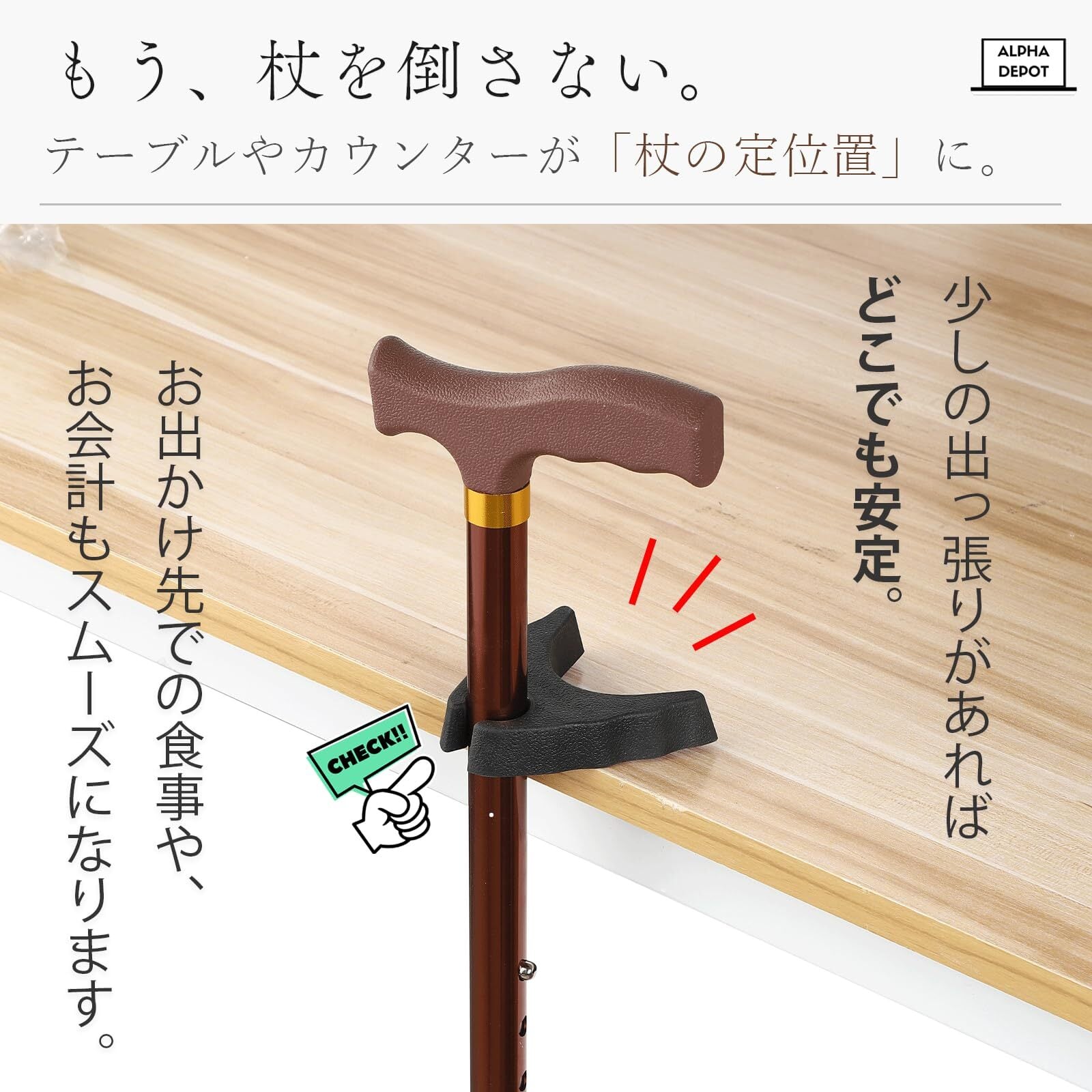 【出先でも置き場に困らない!】テーブルの縁やカウンターなどの出っ張りにサッと掛けてステッキをその場に固定できる便利なホルダーです。