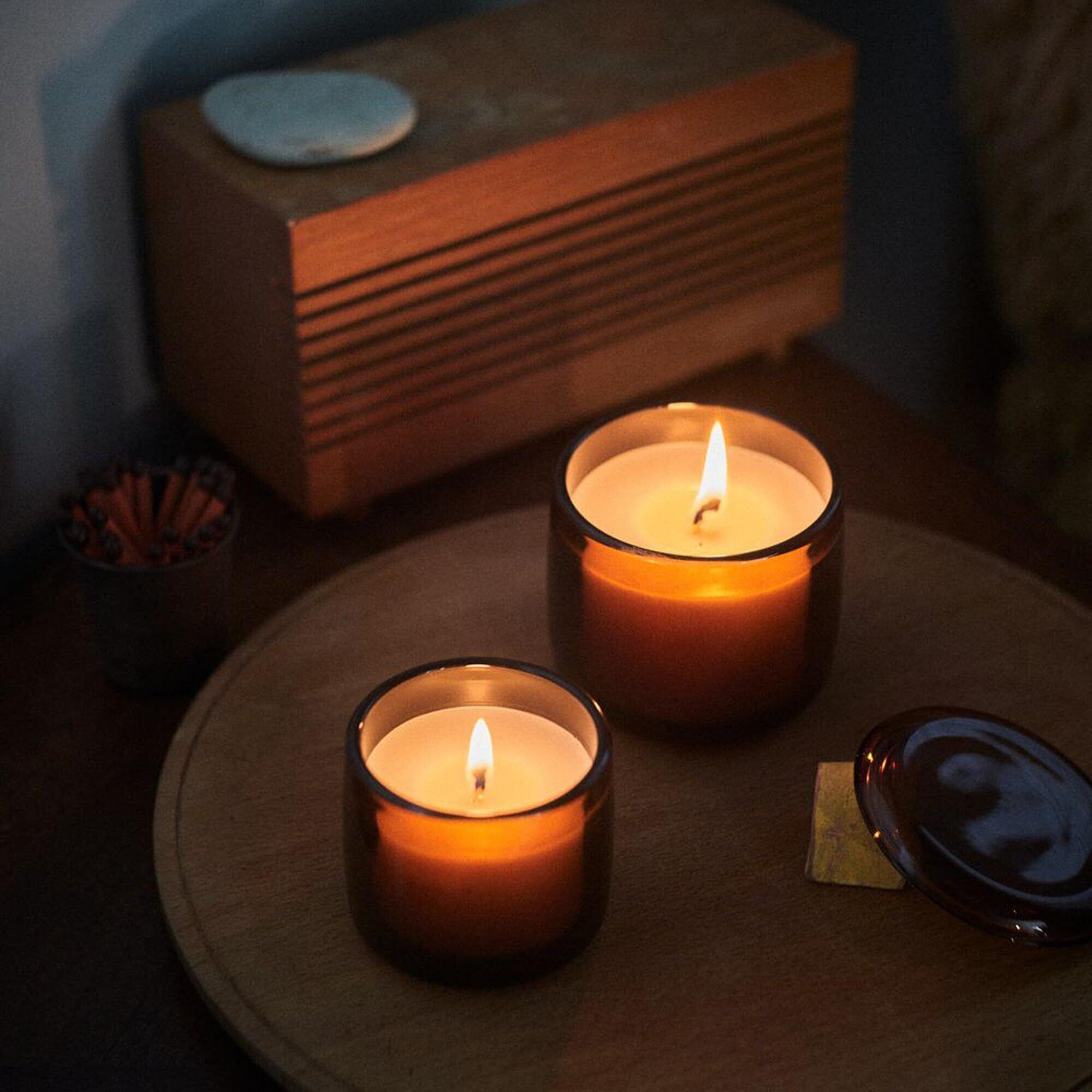 精油をブレンドしたフレグランスキャンドルです。ワックスは植物性です。蓋をかぶせて火を消すことができ、消した時の煙の香りが広がるのを防げます。燃焼時間 約10時間