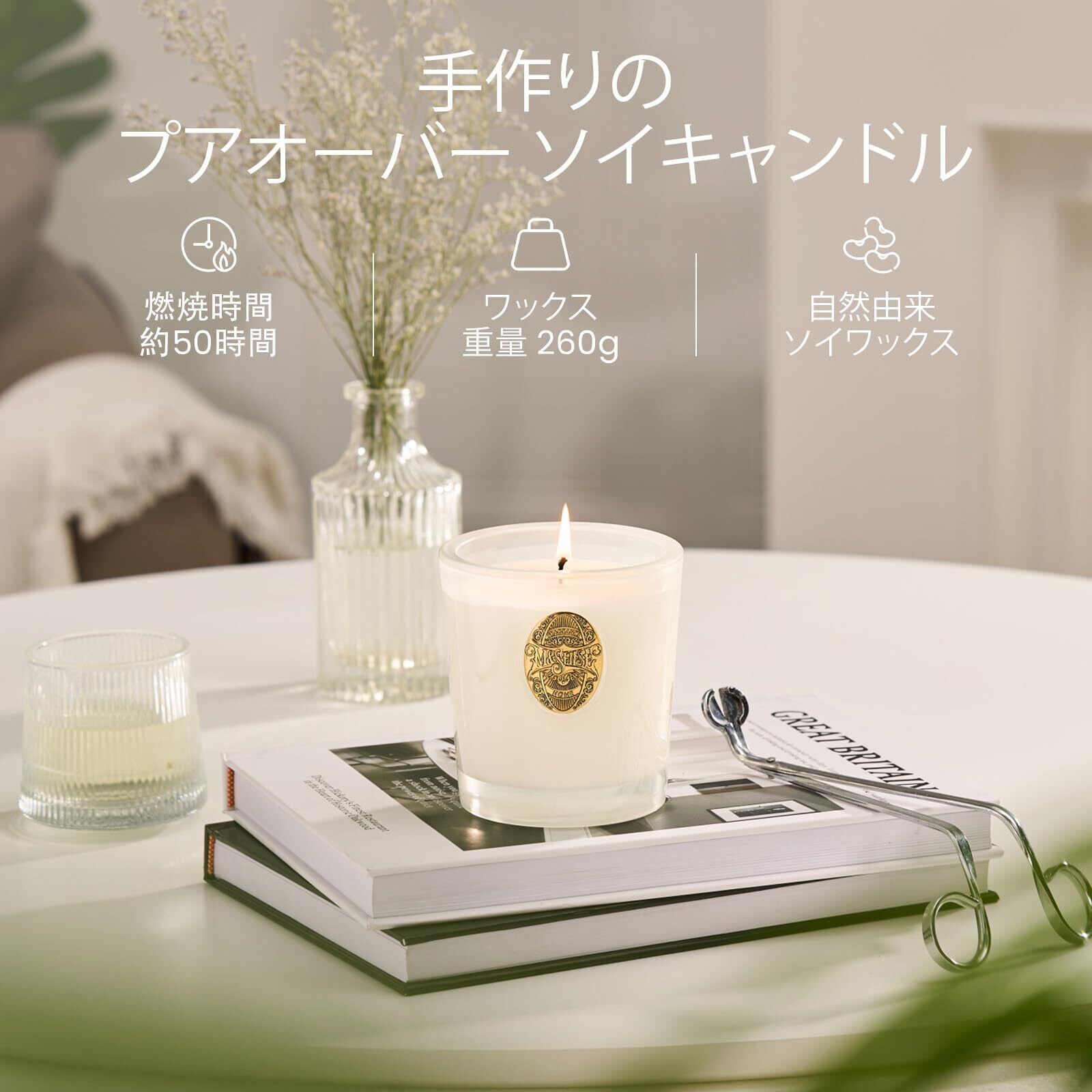 「自然由来素材」:ソイキャンドルと高融点パームオイルを丁寧にブレンドしたソイキャンドルは、最長50時間まで香りが持続します。パームワックスは融点が高く(140°F)、この配合で作られた香り付きキャンドルは 100%ソイワックスのキャンドルよりもゆっくり燃焼し、長持ちします。また、香りの広がりも向上します。